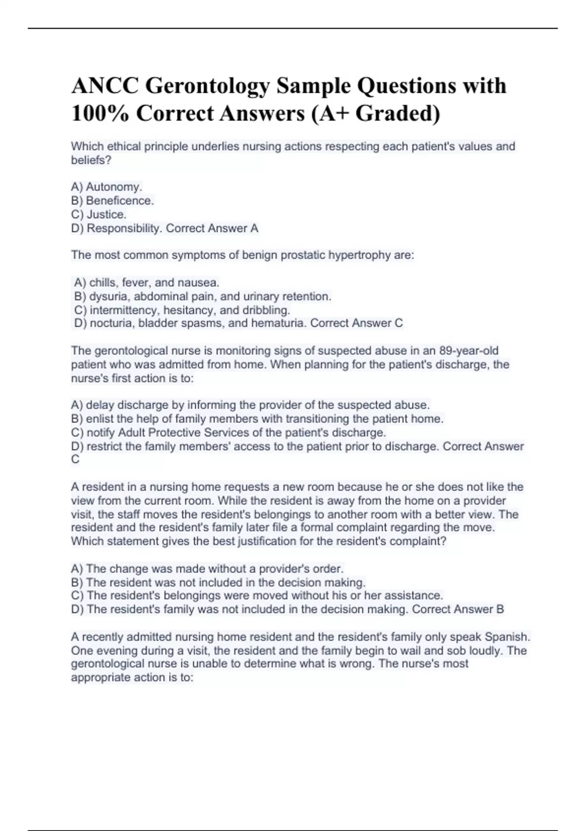 Which ethical principle underlies nursing actions respecting each patient's values and beliefs? A) Autonomy. B) Beneficence. C) Justice. D) Responsibility. Correct Answer A The most common symptoms of benign prostatic hypertrophy are: A) chills, fever, and nausea. B) dysuria, abdominal pain, and urinary retention. C) intermittency, hesitancy, and dribbling. D) nocturia, bladder spasms, and hematuria. Correct Answer C The gerontological nurse is monitoring signs of suspected abuse in an 89-year-old patient who was admitted from home. When planning for the patient's discharge, the nurse's first action is to: A) delay discharge by informing the provider of the suspected abuse. B) enlist the help of family members with transitioning the patient home. C) notify Adult Protective Services of the patient's discharge. D) restrict the family members' access to the patient prior to discharge. Correct Answer C A resident in a nursing home requests a new room because he or she does not like the view from the current room. While the resident is away from the home on a provider visit, the staff moves the resident's belongings to another room with a better view. The resident and the resident's family later file a formal complaint regarding the move. Which statement gives the best justification for the resident's complaint? A) The change was made without a provider's order. B) The resident was not included in the decision making. C) The resident's belongings were moved without his or her assistance. D) The resident's family was not included in the decision making. Correct Answer B A recently admitted nursing home resident and the resident's family only speak Spanish. One evening during a visit, the resident and the family begin to wail and sob loudly. The gerontological nurse is unable to determine what is wrong. The nurse's most appropriate action is to: