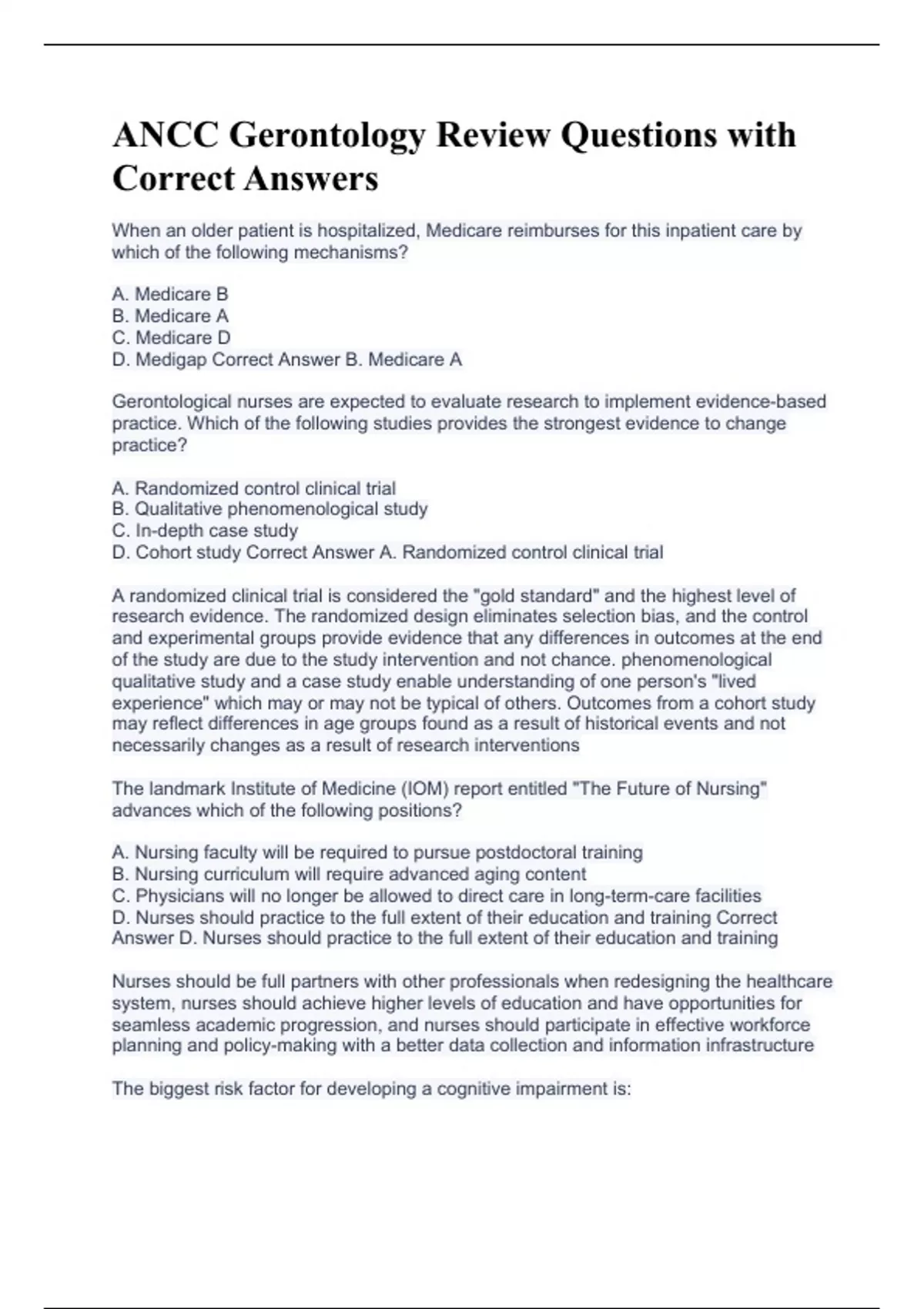 When an older patient is hospitalized, Medicare reimburses for this inpatient care by which of the following mechanisms? A. Medicare B B. Medicare A C. Medicare D D. Medigap Correct Answer B. Medicare A Gerontological nurses are expected to evaluate research to implement evidence-based practice. Which of the following studies provides the strongest evidence to change practice? A. Randomized control clinical trial B. Qualitative phenomenological study C. In-depth case study D. Cohort study Correct Answer A. Randomized control clinical trial A randomized clinical trial is considered the "gold standard" and the highest level of research evidence. The randomized design eliminates selection bias, and the control and experimental groups provide evidence that any differences in outcomes at the end of the study are due to the study intervention and not chance. phenomenological qualitative study and a case study enable understanding of one person's "lived experience" which may or may not be typical of others. Outcomes from a cohort study may reflect differences in age groups found as a result of historical events and not necessarily changes as a result of research interventions The landmark Institute of Medicine (IOM) report entitled "The Future of Nursing" advances which of the following positions? A. Nursing faculty will be required to pursue postdoctoral training B. Nursing curriculum will require advanced aging content C. Physicians will no longer be allowed to direct care in long-term-care facilities D. Nurses should practice to the full extent of their education and training Correct Answer D. Nurses should practice to the full extent of their education and training Nurses should be full partners with other professionals when redesigning the healthcare system, nurses should achieve higher levels of education and have opportunities for seamless academic progression, and nurses should participate in effective workforce planning and policy-making with a better data collection and information infrastructure The biggest risk factor for developing a cognitive impairment is: