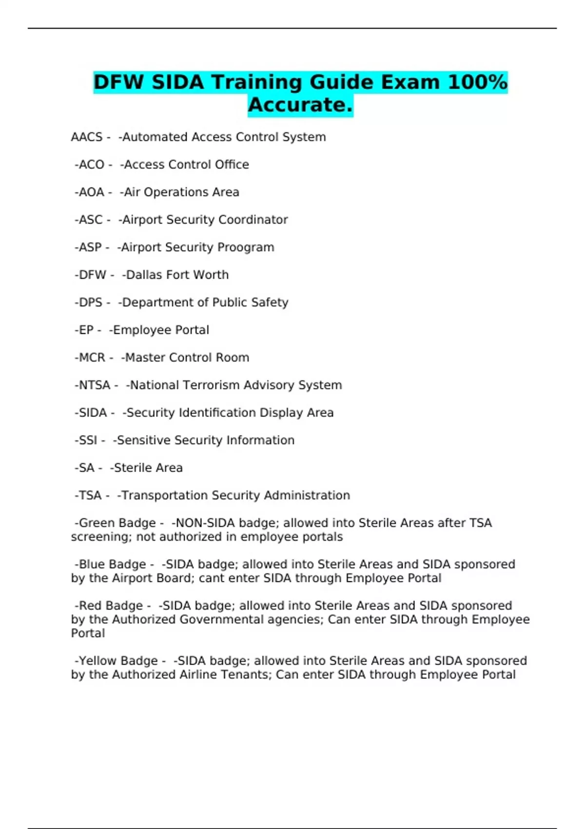 dfw sida training guide exam 100 accurate