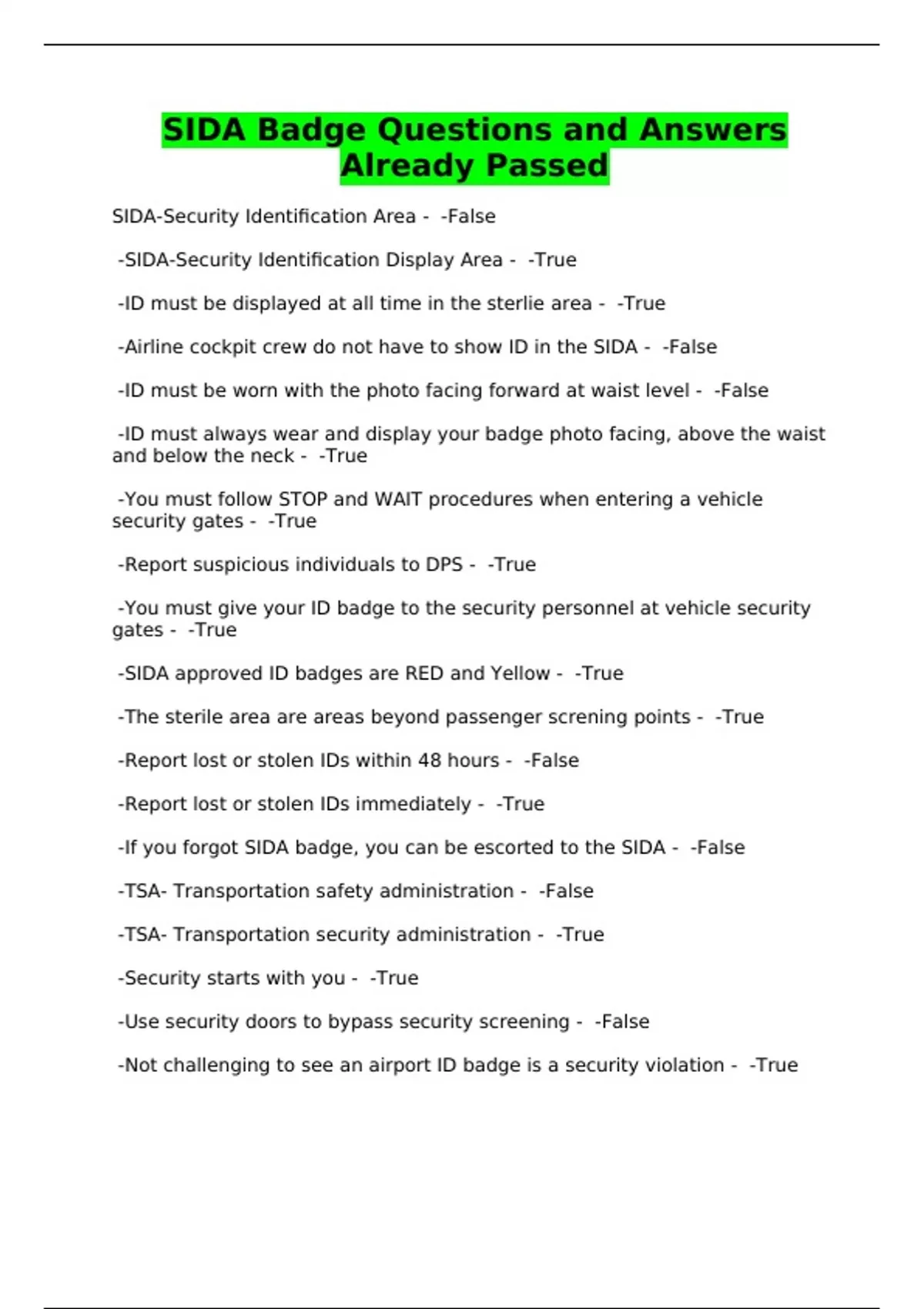 SIDA Badge Questions and Answers Already Passed