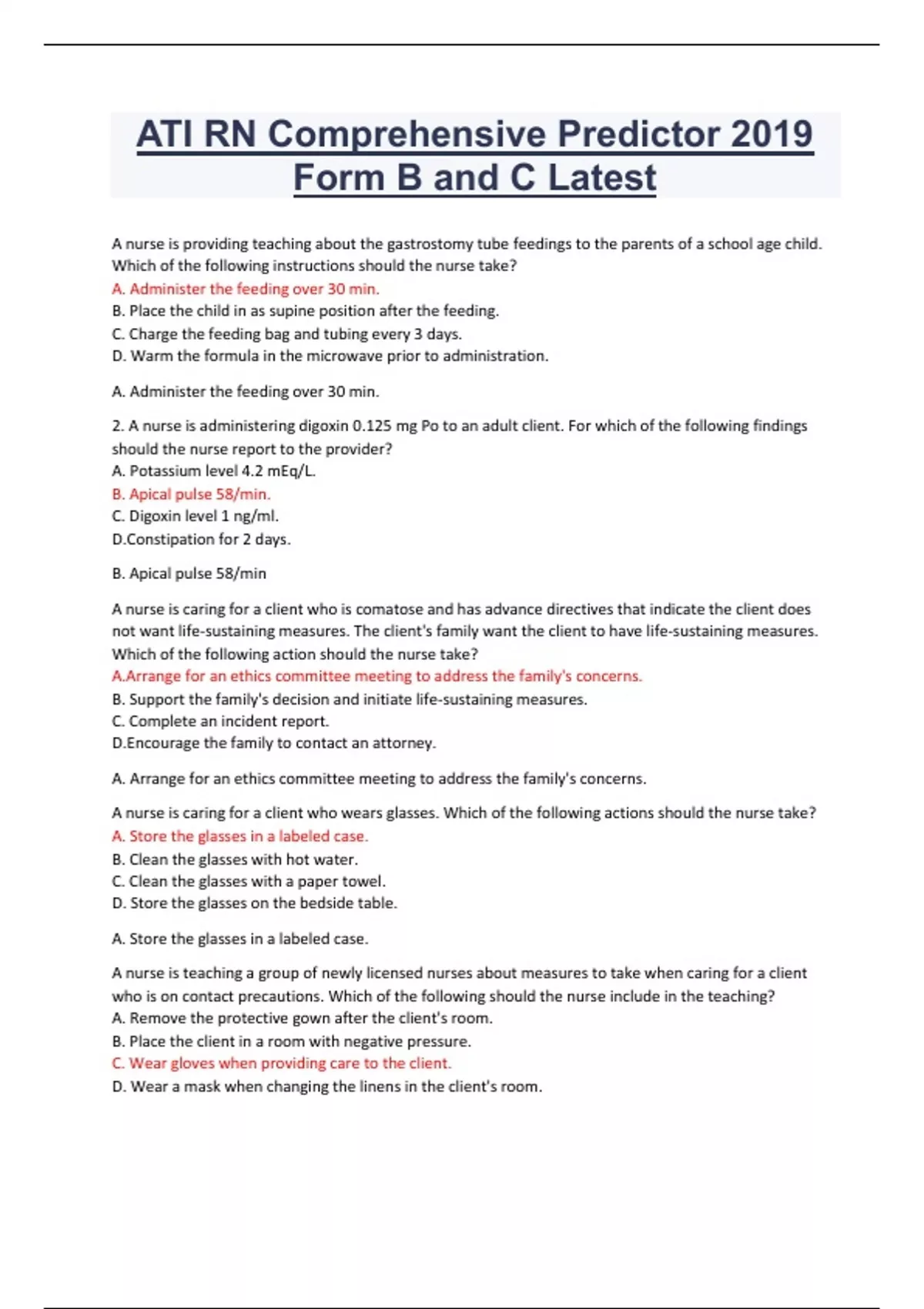 ATI RN Comprehensive Predictor 2019 Form B and C Latest A nurse is providing teaching about the gastrostomy tube feedings to the parents of a school age child. Which of the following instructions should the nurse take? A. Administer the feeding over 30 min. B. Place the child in as supine position after the feeding. C. Charge the feeding bag and tubing every 3 days. D. Warm the formula in the microwave prior to administration. A. Administer the feeding over 30 min. 2. A nurse is administering digoxin 0.125 mg Po to an adult client. For which of the following findings should the nurse report to the provider? A. Potassium level 4.2 mEq/L. B. Apical pulse 58/min. C. Digoxin level 1 ng/ml. D.Constipation for 2 days. B. Apical pulse 58/min A nurse is caring for a client who is comatose and has advance directives that indicate the client does not want life-sustaining measures. The client's family want the client to have life-sustaining measures. Which of the following action should the nurse take? A.Arrange for an ethics committee meeting to address the family's concerns. B. Support the family's decision and initiate life-sustaining measures. C. Complete an incident report. D.Encourage the family to contact an attorney. A. Arrange for an ethics committee meeting to address the family's concerns. A nurse is caring for a client who wears glasses. Which of the following actions should the nurse take? A. Store the glasses in a labeled case. B. Clean the glasses with hot water. C. Clean the glasses with a paper towel. D. Store the glasses on the bedside table. A. Store the glasses in a labeled case. A nurse is teaching a group of newly licensed nurses about measures to take when caring for a client who is on contact precautions. Which of the following should the nurse include in the teaching? A. Remove the protective gown after the client's room. B. Place the client in a room with negative pressure. C. Wear gloves when providing care to the client. D. Wear a mask when changing the linens in the client's room. C. Wear gloves when providing care to the client. A nurse is planning on care for a client who is recovering from an acute myocardial infarction that occurred 3 days ago. Which of the following instructions should the nurse include? A. Perform an ECG every 12 hr. B. Place the client in a supine position while resting. C. Draw a troponin level every 4hr. D. Obtain a cardiac rehabilitation consultation. D. Obtain a cardiac rehabilitation consultation. The nurse is reviewing the medical record of a client who is requesting combination oral contraceptives. Which of the following conditions in the client's history is a contradiction to the use of oral contraceptives? A. Hyperthyroidism. B. Thrombophlebitis. C. Diverticulosis. D. Hypocalcemia B. Thrombophlebitis. A nurse is caring for a client who request the creation of a living will. Which of the following actions should the nurse take? A. Schedule a meeting between the hospital ethics committee and the client. B. Evaluate the client's understanding of life-sustaining measures. C. Determine the client's preferences about post mortem care. D. Request a conference with the client's family. B. Evaluate the client's understanding of life-sustaining measures. A nurse is caring for an adolescent who has sickle-cell anemia. Which of the following manifestations indicates acute chest syndrome and should be immediately reported to the provider? A. Substernal retractions. B. Hematuria. C. Temperature 37.9 C (100.2 F). D. Sneezing. A. Substernal retractions. A nurse is preforming a gastric lavage for a client who has upper gastrointestinal bleeding. Which of the .following action should the nurse take? A. Instill 500 ml of solution through the NG tube. B. Insert a large-bore NG tube. C. Use a cold irrigation solution. D. Instruct the client to lie on his right side. B. Insert a large-bore NG tube.