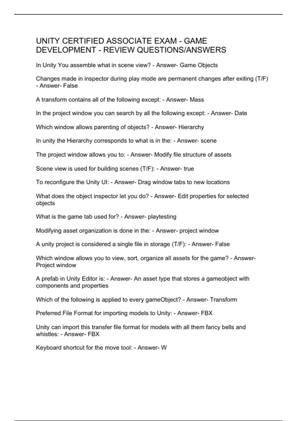 Unity Certified Associate Exam - Game Development - Review Questions/Answers