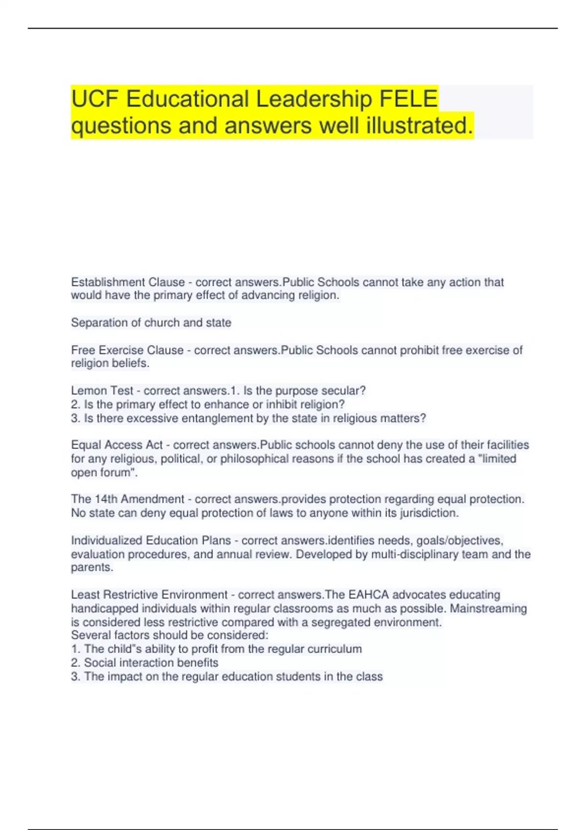 UCF Educational Leadership FELE questions and answers well illustrated. Establishment Clause - correct answers.Public Schools cannot take any action that would have the primary effect of advancing religion. Separation of church and state Free Exercise Clause - correct answers.Public Schools cannot prohibit free exercise of religion beliefs. Lemon Test - correct answers.1. Is the purpose secular? 2. Is the primary effect to enhance or inhibit religion? 3. Is there excessive entanglement by the state in religious matters? Equal Access Act - correct answers.Public schools cannot deny the use of their facilities for any religious, political, or philosophical reasons if the school has created a "limited open forum". The 14th Amendment - correct des protection regarding equal protection. No state can deny equal protection of laws to anyone within its jurisdiction. Individualized Education Plans - correct ifies needs, goals/objectives, evaluation procedures, and annual review. Developed by multi-disciplinary team and the parents. Least Restrictive Environment - correct answers.The EAHCA advocates educating handicapped individuals within regular classrooms as much as possible. Mainstreaming is considered less restrictive compared with a segregated environment. Several factors should be considered: 1. The child‟s ability to profit from the regular curriculum 2. Social interaction benefits 3. The impact on the regular education students in the class Procedural due process - correct cts an individual against arbitrary state action. Certain steps must be followed in order to take away one's individual rights. Procedural due process requires notice and hearing. Substantive due process - correct not a "process" but rather another word for liberty or freedom. It includes life, liberty, property, education, travel, appearance, and the freedoms of religion, speech, press and assembly, as well as, the right to marry, have children, choose a career, or acquire knowledge. Freedom of Speech and Expression - correct answers.Freedom of speech cannot be taken away unless there is clear and present danger for material and substantial disruption. It cannot be used to avoid unpleasantness or an unpopular viewpoint. Search and Seizure - correct answers.Strip searches require "probable cause" because they are considered highly intrusive. New Jersey v. T.L.O. - correct answers.A female student was seen smoking in the bathroom. She denied the accusation and had her purse searched. Officials found drug paraphernalia and letters implicating her as a drug dealer. The court ruled in favor of the school district. Her 4th Amendment rights were not violated. The court found that there was a "nexus" or connection between the infraction and the items searched for. A search is permitted when: 1. The measure is reasonably related to the objectives of the search 2. The search is not intrusive in light of age and sex of the student 3. The reason for the search must justify the degree of the intrusiveness. First Amendment (Teachers) - correct ers had no rights and worked at the pleasure of the board. After 1968, teachers were recognized with constitutional rights and could speak out regarding matters of public concern. Teachers were held to be "Exemplars" of the community. Non-tenured Teachers - correct answers.Unless required by state law or a collective bargaining agreement that states otherwise, a non-tenured teacher can be dismissed without a reason at the end of their contract period. Age Discrimination in Employment Act - correct es maximum age limitation, requires employers to not use age as a factor in deciding promotions, hiring, etc. 40-70 Torts - correct answers.A tort is an intentional or negligent civil wrong. Torts are different from crimes. Negligence - correct answers.These are accidents that should have been prevented through ordinary care. The injury must occur as a result of an "unreasonable risk" taken by another person. FERPA - correct a Federal law that protects the privacy of students‟ educational records. This law applies to all schools that receive funds under an applicable program of the U.S. Department of Education. FERPA gives parents certain rights with respect to their children‟s education records. These rights transfer to the student when he/she reaches the age of 18 or attends a school beyond the high school level. FERPA Parents/Students Rights - correct answers.1. Inspect and review the student‟s education records maintained by the school. 2. Request that a school correct records which they believe to be inaccurate or misleading. 3. If the school does not remove it, the parents or eligible students have the right to a hearing. 4. After the hearing, if it is not removed, parents or eligible students have the right to place a statement with the record. Fair Use Act - correct s have ruled that it is in the public interest to allow certain uses of copyright materials. This is what teacher‟s have. Teachers are permitted to make single copies for the following copyrighted works for their own use in scholar research or classroom preparation: Chapter of a book Article from a periodical Short story, short essay, or short poem Chart, graph, diagram, cartoon, or picture FTE - correct answers.Full-time equivalent. A student can be counted as 1.0 FTE for 900 hours of instruction during the school year (180 days X 5 hr/day). If a student attend less than the full day, their FTE = # min/wk / 1500. When referring to FTE, the state is referring to "headcount". Individuals with Disabilities Education Act (IDEA) - correct answers.This act was a revision of the Education of the Handicapped Act (EHA) otherwise known as PL 94- 142. This act provides entitlement dollars to state and local education agencies to supplement educational services for the handicapped. Property taxes - correct the most common type of local sources of funds. Sales Tax - correct the primary state source for funding public education in Fl