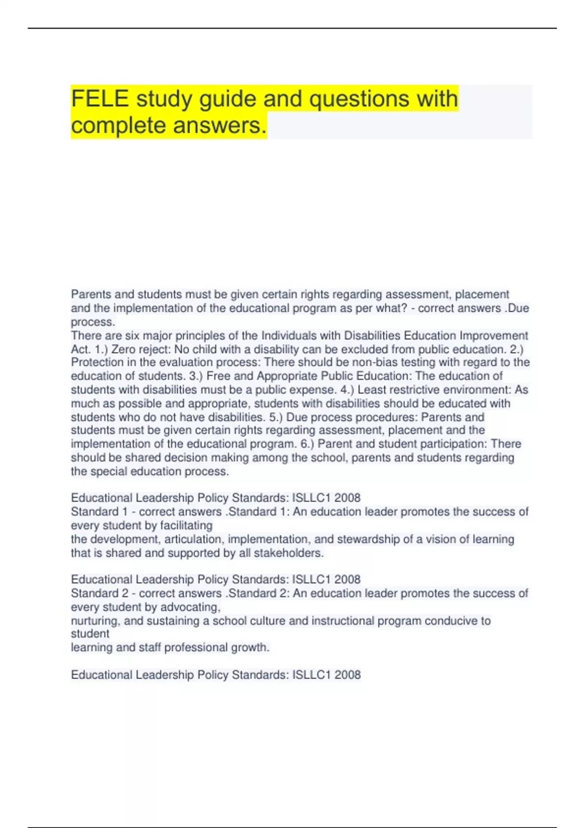 FELE study guide and questions with complete answers. Parents and students must be given certain rights regarding assessment, placement and the implementation of the educational program as per what? - correct answers .Due process. There are six major principles of the Individuals with Disabilities Education Improvement Act. 1.) Zero reject: No child with a disability can be excluded from public education. 2.) Protection in the evaluation process: There should be non-bias testing with regard to the education of students. 3.) Free and Appropriate Public Education: The education of students with disabilities must be a public expense. 4.) Least restrictive environment: As much as possible and appropriate, students with disabilities should be educated with students who do not have disabilities. 5.) Due process procedures: Parents and students must be given certain rights regarding assessment, placement and the implementation of the educational program. 6.) Parent and student participation: There should be shared decision making among the school, parents and students regarding the special education process. Educational Leadership Policy Standards: ISLLC1 2008 Standard 1 - correct answers .Standard 1: An education leader promotes the success of every student by facilitating the development, articulation, implementation, and stewardship of a vision of learning that is shared and supported by all stakeholders. Educational Leadership Policy Standards: ISLLC1 2008 Standard 2 - correct answers .Standard 2: An education leader promotes the success of every student by advocating, nurturing, and sustaining a school culture and instructional program conducive to student learning and staff professional growth. Educational Leadership Policy Standards: ISLLC1 2008 Standard 3 - correct answers .Standard 3: An education leader promotes the success of every student by ensuring management of the organization, operation, and resources for a safe, efficient, and effective learning environment. Educational Leadership Policy Standards: ISLLC1 2008 Standard 4 - correct answers .Standard 4: An education leader promotes the success of every student by collaborating with faculty and community members, responding to diverse community interests and needs, and mobilizing community resources. Educational Leadership Policy Standards: ISLLC1 2008 Standard 5 - correct answers .Standard 5: An education leader promotes the success of every student by acting with integrity, fairness, and in an ethical manner. Educational Leadership Policy Standards: ISLLC1 2008 Standard 6 - correct answers .Standard 6: An education leader promotes the success of every student by understanding, responding to, and influencing the political, social, economic, legal, and cultural context. Unallocated funds is best described as... - correct answers .Carryover funds During the budgeting process, school districts may have money that is left over and not spent during the current school's fiscal year, known as carryover funds. These funds can be used for the next year's expenses. Depending on the state the school district is located will determine who will approve the carry over funds. Florida Educator Accomplished Practices - correct answers .There are 12 accomplished practices. The Florida Educator Accomplished Practices are considered the core standards for effective educators and they are based upon 3 different foundational principles: focus on high expectations, knowledge of subject matter, and the standards of the education profession. They are: assessment, communication, continuous improvement, critical thinking, diversity, ethics, human development and learning, knowledge of subject matter, learning environments, planning, role of the teacher, and technology. Decision matrix process - correct answers .A decision matrix, also known as Pugh matrix, selection grid, and criteria based matrix, is used to evaluate and prioritize a list of options that can be used to make a decision. The decision matrix procedure is a 6 step process. They are brainstorm evaluation criteria, discuss and refine the list of criteria, assign a relative weight to each criterion, create a matrix with the criteria and their weights, evaluate each choice against the criteria, and determine the criteria with the highest, most important weight.