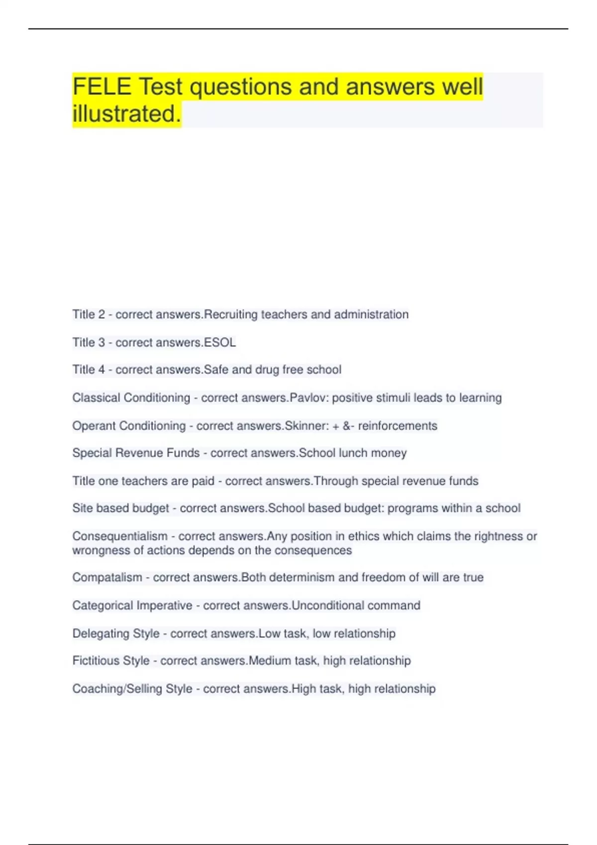 FELE Test questions and answers well illustrated. Title 2 - correct answers.Recruiting teachers and administration Title 3 - correct answers.ESOL Title 4 - correct answers.Safe and drug free school Classical Conditioning - correct answers.Pavlov: positive stimuli leads to learning Operant Conditioning - correct answers.Skinner: + &- reinforcements Special Revenue Funds - correct answers.School lunch money Title one teachers are paid - correct answers.Through special revenue funds Site based budget - correct answers.School based budget: programs within a school Consequentialism - correct answers.Any position in ethics which claims the rightness or wrongness of actions depends on the consequences Compatalism - correct answers.Both determinism and freedom of will are true Categorical Imperative - correct answers.Unconditional command Delegating Style - correct answers.Low task, low relationship Fictitious Style - correct answers.Medium task, high relationship Coaching/Selling Style - correct answers.High task, high relationship Participation/Collaborative/Supportive Style - correct answers.Low task, high relationship Telling/Directive Style - correct answers.High task, low relationship Four types of School Culture - correct answers.1. Family 2.Machine 3.Cabaret 4. Little Shop of Horrors Machine - correct answers.So involved in the running of the school that the needs of the students get forgotten, teachers feel like a number Little Shop of Horrors - correct answers.Harsh environment, not predictable, increased stress Pluralism - correct answers.Mutual respect, acceptance, teamwork, and productivity Alterity - correct answers.Being different Dynamic Responsibility - correct answers.Embracing problems and challenges Ethical congruence - correct answers.Decisions align with values Establishment Clause - correct answers.Most of the time when a public school system promotes or supports a religion it is a violation of this clause Florida META Consent Agreement - correct answers.Addresses the right of ELL students and their right to equal access to all education programs. Provides a structure that ensures the ensures the delivery of comprehensible instruction 4th Amendment - correct answers.Protects individuals from unreasonable government searches and seizure Reasonable suspicion - correct answers.School officials only need this to search a student's possessions Probable cause - correct answers.Law enforcement needs this to search a student's possessions Title 7 - correct answers.Prohibits employment questions which are discriminatory such as age, sex, religious preferences, marital status, handicapping condition, etc. Mills v. Board of Education (1972) - correct answers.Handicapped students were suspended or expelled from school without due process. The court held that handicapped students must receive specialized instruction and due process before suspension, expulsion, or reassignment. The education must be free and suitable regardless of a child's mental, physical, or emotional handicap. 900 - correct answers.The equivalent for a standard school with students in grades 4-12 is how many hours of instruction per year? Four elements of a budget - correct answers.Planning, receiving funds, spending funds, evaluating results Fiscal Year - correct answers.July1-June30 720 - correct answers.K-3 hours of instruction a year District cost differential - correct answers.Different amount of money needed to do business in different counties Material and Supplies vs. Capital Outlay - correct answers.M&S- one year Capital Outlay- supplies that last more than one year In due process the following items need to be obtained - correct answers.1. Tell the student what he/she did 2. Get his/her side 3. Give the witness reports without names Culture - correct answers.Norms and beliefs Climate - correct answers.Overall feeling of well being Free Exercise Clause - correct answers.Public Schools cannot prohibit free exercise of religious beliefs Procedural Due Process - correct answers.Protects an individual against arbitrary state action, requires notice and hearing FERPA - correct answers.Protects student's educational records 1. Review education records 2. Request school correct inaccurate or misleading records, if not parents have a right to hearing, can place statement in record Database - correct answers.Collection of info organized for easy retrieval 1.File 2. Record 3. Field Proprietary Software - correct answers.Privately created owned, and copyrighted software that must be purchased from the vendor or owner, commercial software Shareware - correct answers.Copyrighted software that is distributed for sample use