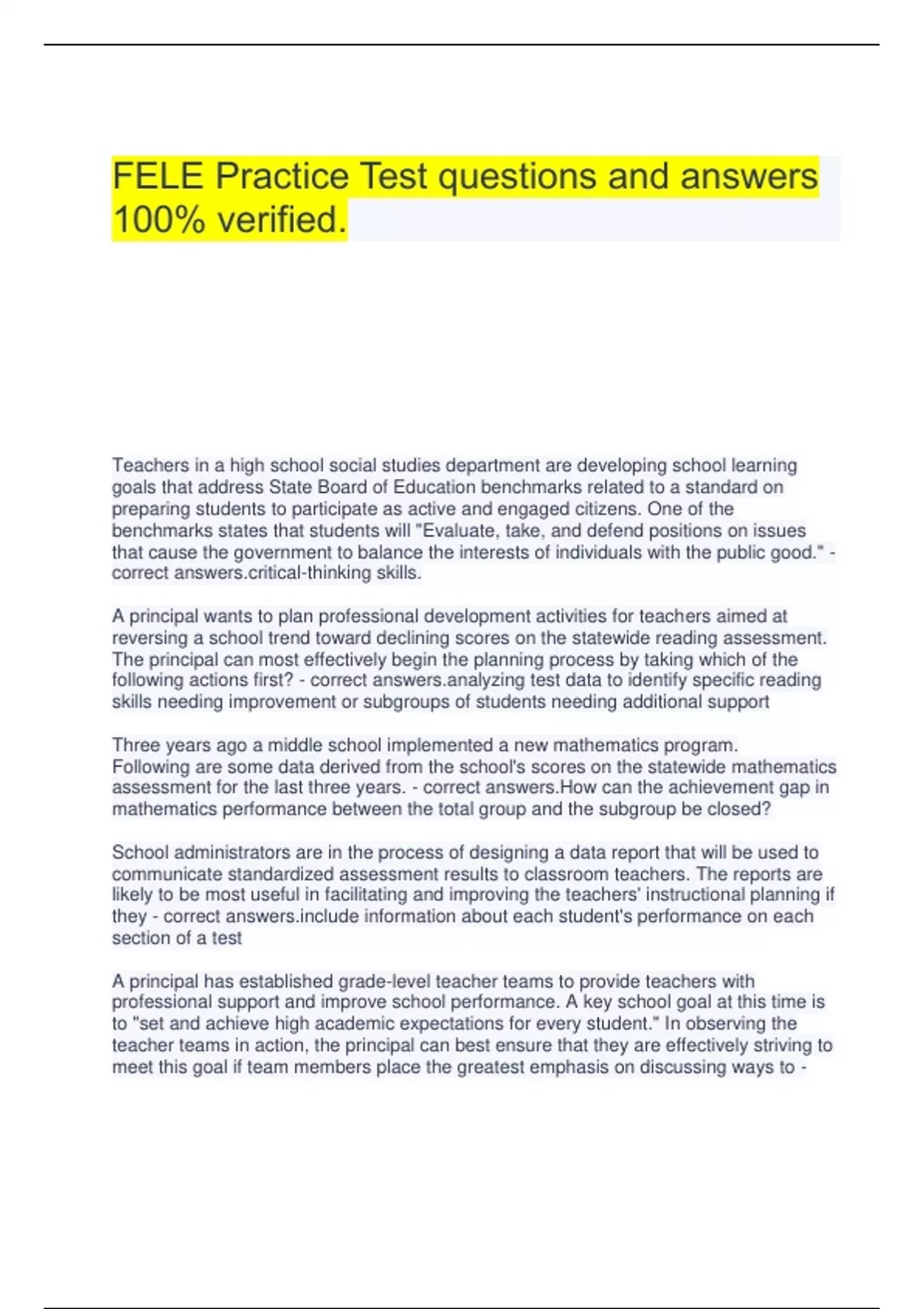 FELE Practice Test questions and answers 100% verified. Teachers in a high school social studies department are developing school learning goals that address State Board of Education benchmarks related to a standard on preparing students to participate as active and engaged citizens. One of the benchmarks states that students will "Evaluate, take, and defend positions on issues that cause the government to balance the interests of individuals with the public good." - correct cal-thinking skills. A principal wants to plan professional development activities for teachers aimed at reversing a school trend toward declining scores on the statewide reading assessment. The principal can most effectively begin the planning process by taking which of the following actions first? - correct zing test data to identify specific reading skills needing improvement or subgroups of students needing additional support Three years ago a middle school implemented a new mathematics program. Following are some data derived from the school's scores on the statewide mathematics assessment for the last three years. - correct answers.How can the achievement gap in mathematics performance between the total group and the subgroup be closed? School administrators are in the process of designing a data report that will be used to communicate standardized assessment results to classroom teachers. The reports are likely to be most useful in facilitating and improving the teachers' instructional planning if they - correct de information about each student's performance on each section of a test A principal has established grade-level teacher teams to provide teachers with professional support and improve school performance. A key school goal at this time is to "set and achieve high academic expectations for every student." In observing the teacher teams in action, the principal can best ensure that they are effectively striving to meet this goal if team members place the greatest emphasis on discussing ways to - correct nd to students who are progressing at different rates in the classroom. A recently hired principal at a low-performing school wishes to create a school climate that fosters strong academic achievement for all students. Which of the following approaches by the principal would best help promote attainment of this goal? - correct a variety of means to communicate a vision of high expectations for students and faculty on a regular basis A principal, who has been reviewing student scores on the statewide assessment, is concerned about a significant and rapid decline in the performance of students from a subgroup in the school. The principal's best initial response would be to involve faculty and staff in - correct mining specific factors that are likely to be causing or contributing to the observed student trend. A recently hired principal wishes to evaluate teacher quality in the school by determining the extent to which the Florida Educator Accomplished Practices are currently being implemented. The principal can best achieve this goal by taking which of the following actions first? - correct ging to spend time observing in each teacher's classroom A recently hired middle school principal has determined that many students from one subgroup, which makes up approximately one-quarter of the student body, often do not benefit fully from the instruction their teachers are delivering. The principal wants to offer the faculty suggestions for improving their performance in regard to this issue. - correct a variety of materials during instruction that are likely to be relevant and meaningful to all students Last year a school district initiated an interim assessment program in which two interim assessments aligned with state-adopted standards for mathematics would be administered each year to students in grades 3 through 10. Which of the following issues should a principal in the district consider the most important concern during the first year of implementing the interim assessment? - correct answers.The interim assessment results were not available to school staff until nearly 3 months after they were administered Which of the following practices observed in an elementary classroom would best reflect the teacher's commitment to the belief that all students are capable of learning and achieving academic success? - correct increasingly intensive instructional interventions for students who continue to struggle A principal undertakes outreach to recruit individuals in the community who are interested in playing an active role in the school. Such roles include serving as a classroom volunteer, making classroom presentations in curriculum-aligned areas of expertise, and serving as a mentor to selected students. In doing so, the principal makes it a priority to reach out to members of the various demographic groups that make up the school community. - correct ting all students' school success by valuing diversity A principal who is new to a school plans to use student results on both district- mandated interim assessments and annual statewide assessments to help monitor teacher performance. In using this approach, the principal can best help assure fair and accurate monitoring by taking into consideration the - correct ous performance of the students in each teacher's class. A principal recently led the development of a comprehensive database that includes standardized test results, classroom assessment results, and report card grades for all of the students in each grade level. Teachers can easily access the database to review existing information and enter new information - correct gthening instructional decision making An elementary school principal is aware that certain student groups in the school, such as ELLs and students with an economically disadvantaged classification, tend to perform at substantially lower levels than their peers both in the classroom and on standardized tests. The principal can best address