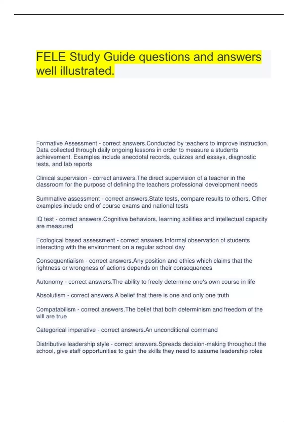 FELE Study Guide questions and answers well illustrated. Formative Assessment - correct answers.Conducted by teachers to improve instruction. Data collected through daily ongoing lessons in order to measure a students achievement. Examples include anecdotal records, quizzes and essays, diagnostic tests, and lab reports Clinical supervision - correct answers.The direct supervision of a teacher in the classroom for the purpose of defining the teachers professional development needs Summative assessment - correct answers.State tests, compare results to others. Other examples include end of course exams and national tests IQ test - correct answers.Cognitive behaviors, learning abilities and intellectual capacity are measured Ecological based assessment - correct answers.Informal observation of students interacting with the environment on a regular school day Consequentialism - correct answers.Any position and ethics which claims that the rightness or wrongness of actions depends on their consequences Autonomy - correct answers.The ability to freely determine one's own course in life Absolutism - correct answers.A belief that there is one and only one truth Compatabilism - correct answers.The belief that both determinism and freedom of the will are true Categorical imperative - correct answers.An unconditional command Distributive leadership style - correct answers.Spreads decision-making throughout the school, give staff opportunities to gain the skills they need to assume leadership roles Downward communication - correct answers.Information is exchanged from a higher level of leadership downward to staff Upward communication - correct answers.Information is conveyed from staff to higher level leaders Horizontal communication - correct answers.Individuals interacting with in their peer group Diagonal communication - correct answers.Individuals pass on information between one school to another school or between other departments The developmental assessment center - correct answers.Developed by the national Association of secondary school principals to assist with the professional development of school leaders Curriculum alignment - correct answers.The coordination of the written, taught, and tested curriculum Multicultural plan policy statement - correct answers.BANKS-goal is to outline how and when schools will implement educational opportunities that are multicultural Program audit - correct answers.Elements include signed agreement of acceptance and will adhere to requirements. Zero reject (IDEA) - correct answers.No child with a disability can be excluded from public education Protection in the evaluation process (IDEA) - correct answers.There should be non-bias testing with regard to the education of students Free and appropriate public education (FAPE) (IDEA) - correct answers.The education of students with disabilities must be a public expense Due process Procedures (IDEA) - correct answers.Parents and students must be given certain rights regarding assessment placement and the implementation of the educational program Parent and student participation (IDEA) - correct answers.There should be shared decision-making among the school parents and students regarding the special education process High task/high relationship - correct answers.Coaching or selling style Low task/high relationship - correct answers.Participating or collaborative or supporting style Low task/low relationship - correct answers.Delegating style Direct teaching - correct answers.And instructional method that allows the teacher to demonstrate or model the material to students rather than allowing exploratory learning. Founded by SIEGFRIED ENGELMANN Academic language - correct answers.Must be understood in order to improve test scores and academic achievement with ELL students Machine culture OWENS& STEINHOFF - correct answers.Leader is so involved in managing the school and making sure it runs efficiently that he does not put the best interests of the students first or make good decisions for the students, teachers feel they are not connected Little shop of horrors culture OWENS & STEINHOFF - correct answers.Set rules, no one can change them. Harsh, intimidating, not approachable, not predictable, faculty and staff don't know what will happen, increased stress Sheltered English - correct answers.Transition or bridge classes, allow ELL students to be held to the same curriculum standards as their English speaking counterparts Commander leader - correct answers.Can be derailed by becoming domineering or intimidating Strategist leader - correct answers.Smart, analytical and process oriented Visionary leader - correct answers.Motivational and charismatic but can come off as overconfident and unrealistic Change agent - correct answers.Always looking for ways to do things better Reliable test - correct answers.Test questions get the same results each time they are used. Questions are clear and unambiguous National assessment of education progress (NAEP) - correct answers.Provides assessments of student achievement and various subjects. Run by the US DOE. Most comprehensive assessment of what American students know and can do Visionary leadership style DANIEL GOLEMAN - correct answers.Moves people towards a shared vision, tells them where to go but not how to get there, causes motivation to struggle forward, openly