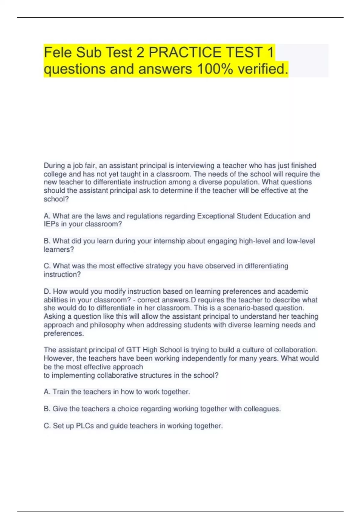 Fele Sub Test 2 PRACTICE TEST 1 questions and answers 100% verified. During a job fair, an assistant principal is interviewing a teacher who has just finished college and has not yet taught in a classroom. The needs of the school will require the new teacher to differentiate instruction among a diverse population. What questions should the assistant principal ask to determine if the teacher will be effective at the school? A. What are the laws and regulations regarding Exceptional Student Education and IEPs in your classroom? B. What did you learn during your internship about engaging high-level and low-level learners? C. What was the most effective strategy you have observed in differentiating instruction? D. How would you modify instruction based on learning preferences and academic abilities in your classroom? - correct answers.D requires the teacher to describe what she would do to differentiate in her classroom. This is a scenario-based question. Asking a question like this will allow the assistant principal to understand her teaching approach and philosophy when addressing students with diverse learning needs and preferences. The assistant principal of GTT High School is trying to build a culture of collaboration. However, the teachers have been working independently for many years. What would be the most effective approach to implementing collaborative structures in the school? A. Train the teachers in how to work together. B. Give the teachers a choice regarding working together with colleagues. C. Set up PLCs and guide teachers in working together. D. Provide teachers with research showing the effectiveness of working together. - correct answers.A. The first thing that has to happen in this situation is teaching people how to work together. A leader cannot just throw teachers into the deep end of collaboration if the teachers are not familiar with the practice. Once the teachers are trained and comfortable working together, then leadership can set up PLCs. Simply giving teachers the choice to work with whomever they want is not effective because they do not really work together to begin with. Providing research is effective but not as effective as training teachers. A is your best answer here. A new teacher at ATT Elementary is having a difficult time with classroom management. He has come to the principal for help. How can the principal best assist the teacher? A. Ask the district to provide the teacher with a mentor. B. Provide the teacher with time out of the classroom where he can observe teachers who excel in classroom management. C. Provide the teacher with targeted professional development. D. Set up a book study on classroom management and invite the teacher to attend. - correct answers.B. A principal does not have the time to mentor every teacher in the building when problems answer is B because the principal should provide time and resources so the teacher can help himself in this situation. Providing time and resources so the teacher can observe another teacher in action is the best choice here. It has been decided by administration that a teacher will be terminated because of gross immorality. Whatshould be the administration's concern during the process? A. reporting the termination in a timely manner to the district B. reporting the termination in a timely manner to the teacher C. keeping the circumstances aligned with confidentiality protocols D. keeping the circumstances out of the newspaper - correct answers.C. The most important thing here is for the administrator to follow protocols concerning confidentiality.When in doubt, do not say a word about anyone's file, disciplinary action, or other sensitive information. Which of the following is when a teacher is setting the expectations for the lesson by working with students to understand the skills and behaviors they will acquire during the lesson? A. engaging effectively with learners B. collaborating with peers C. using effective classroom management D. using objectives to drive instruction - correct answers.D. Setting expectations and communicating what students will be able to do after the lesson is using expectations to drive instruction. Objectives are the skills and behaviors students will have or display at the end of the lesson. The principal of ACC High School has been working collaboratively with teachers for several years. The principal is well-liked by the community and staff. She is warm and inviting to all members of the staff. What type of power does this principal have? A. referent B. expert C. legitimate D. coercive - correct answers.A. Referent power is being well-liked by stakeholders A principal has been placed at a failing school to act as a change agent. She knows reorganization of departments, grade levels, and even administrative positions are necessary. What should she do first to be as effective as possible in this situation? A. analyze the budget B. conduct a climate survey C. form a committee of effective teachers D. call the district for guidance - correct answers.B. Before the principal can do anything effectively, she must take the temperature of the school. She can do that by using a climate survey and the data collected to drive future decisions. Analyzing the budget to determine where resources can be allocated comes after collecting the data from the survey. Forming a committee is skipping a few steps. That will come later. Calling the district for guidance is never the answer. She is the principal; she has to make it work. A principal becomes aware that a couple of his teacher leaders are communicating dislike of the state standards. It seems the teacher leaders are telling other teachers the standards are ineffective in increasing reading achievement. When he asks the teacher leaders, they admit that they do not feel the standards are adequate. The principle should: A. remind the teacher leaders the standards are the criteria established by the state and shall be followed. B.