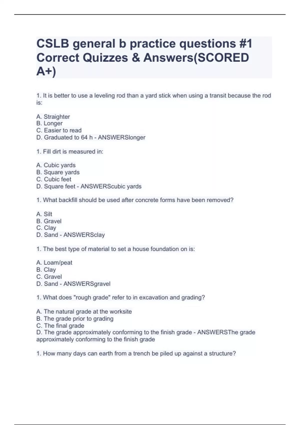 1. It is better to use a leveling rod than a yard stick when using a transit because the rod is: A. Straighter B. Longer C. Easier to read D. Graduated to 64 h - ANSWERSlonger 1. Fill dirt is measured in: A. Cubic yards B. Square yards C. Cubic feet D. Square feet - ANSWERScubic yards 1. What backfill should be used after concrete forms have been removed? A. Silt B. Gravel C. Clay D. Sand - ANSWERSclay 1. The best type of material to set a house foundation on is: A. Loam/peat B. Clay C. Gravel D. Sand - ANSWERSgravel 1. What does "rough grade" refer to in excavation and grading? A. The natural grade at the worksite B. The grade prior to grading C. The final grade D. The grade approximately conforming to the finish grade - ANSWERSThe grade approximately conforming to the finish grade 1. Ho