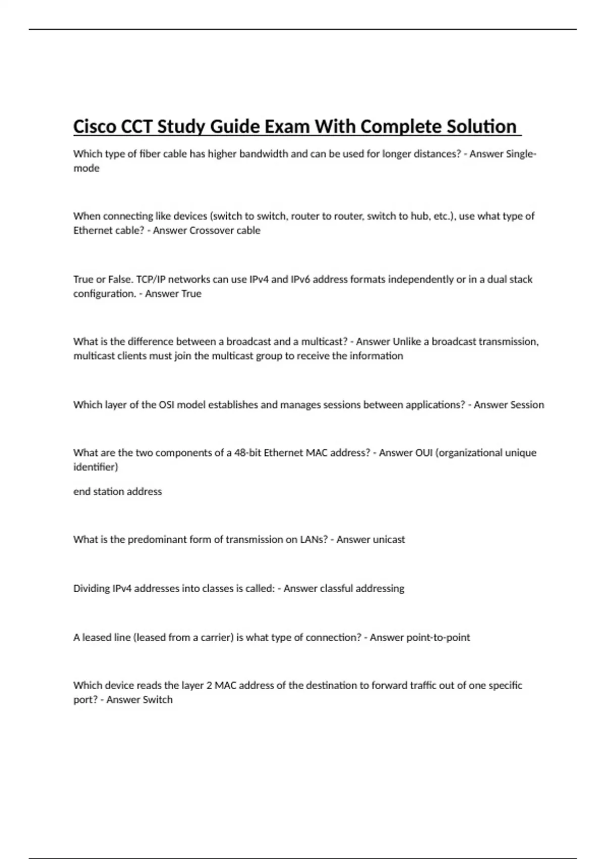Which type of fiber cable has higher bandwidth and can be used for longer distances? - Answer Single-mode When connecting like devices (switch to switch, router to router, switch to hub, etc.), use what type of Ethernet cable? - Answer Crossover cable True or False. TCP/IP networks can use IPv4 and IPv6 address formats independently or in a dual stack configuration. - Answer True What is the difference between a broadcast and a multicast? - Answer Unlike a broadcast transmission, multicast clients must join the multicast group to receive the information Which layer of the OSI model establishes and manages sessions between applications? - Answer Session What are the two components of a 48-bit Ethernet MAC address? - Answer OUI (organizational unique identifier) end station address What is the predominant form of transmission on LANs? - Answer unicast Dividing IPv4 addresses into classes is called: - Answer classful addressing A leased line (leased from a carrier) is what type of connection? - Answer point-to-point Which device reads the layer 2 MAC address of the destination to forward traffic out of one specific port? - Answer Switch Ethernet runs on which layers of the OSI model? - Answer Layer 1 and 2 Which type of connection is dedicated to the subscriber instead of shared bandwidth? - Answer point-to-point Routers operate at what layer of the OSI model? - Answer Layer 3 - Network Layer Which layer of the OSI model routes data packets and selects the best path to deliver data? - Answer Network layer What is a digital device used to connect a router to a digital circuit, like a Leased Line? - Answer CSU/DSU ATM cells are a fixed length of how many bytes? - Answer 53 What is a communication where a sender addresses a specific group of devices or clients (one sender and pre-defined receivers)? - Answer Multicast What is the main benefit of creating separate broadcast domains? - Answer so that broadcasts are limited to a domain rather than the entire network A wireless repeater requires how much overlap between the wired access point on the backbone and the wireless repeater? - Answer 50 percent A communications network that operates beyond the scope of a LAN is called? - Answer WAN (wide area network) In wireless topology, extended service areas (ESA) cells are recommended to have how much overlap to allow users to roam without losing connections? - Answer 10-15 percent Switches operate at what layer of the OSI model? - Answer Layer 2