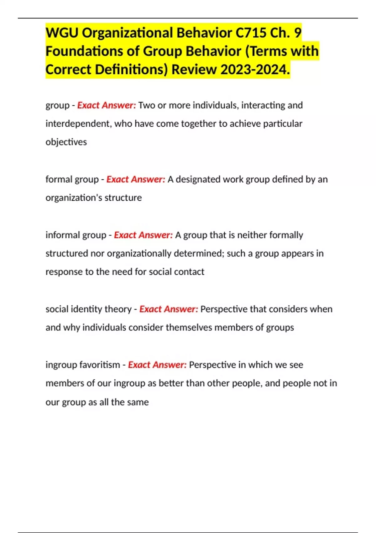 WGU Organizational Behavior C715 Ch. 9 Foundations of Group Behavior (Terms with Correct Definitions) Review .