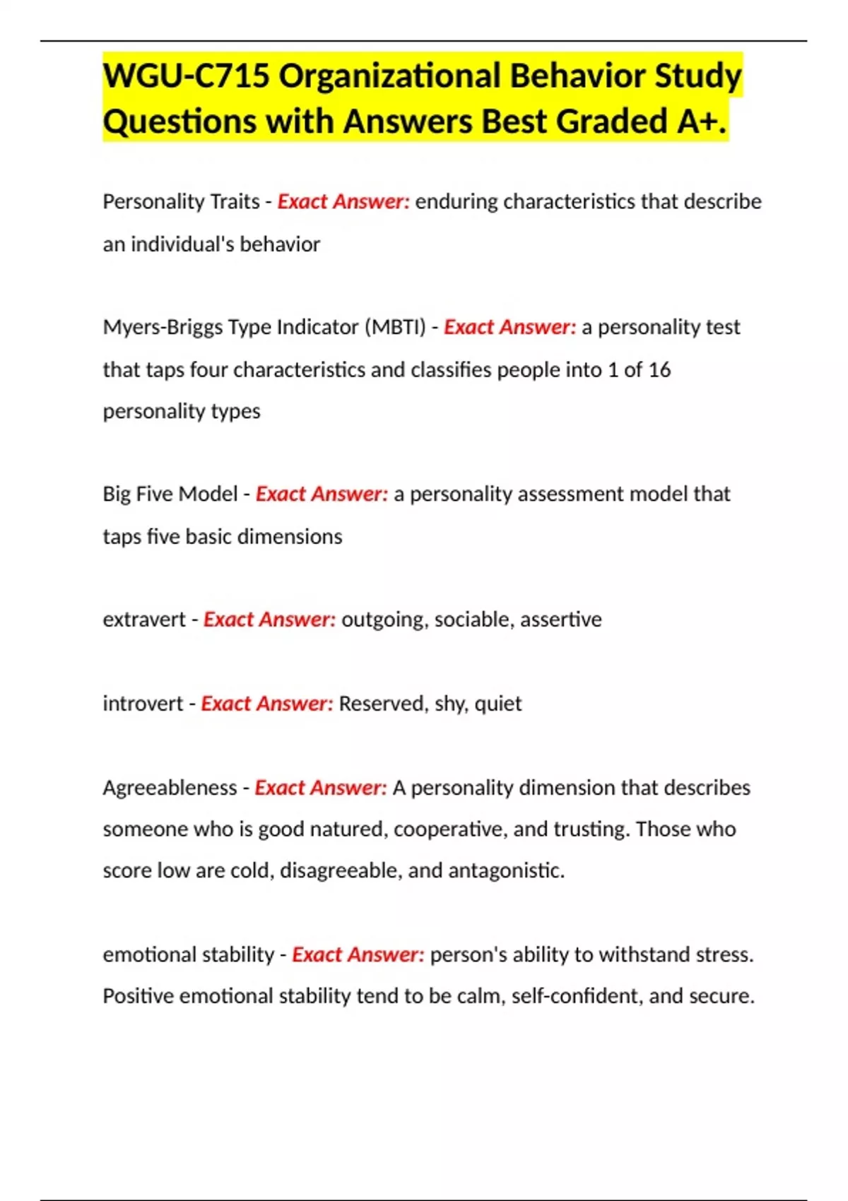 WGU C715 ORGANIZATIONAL BEHAVIOR STUDY GUIDE PACKAGE.