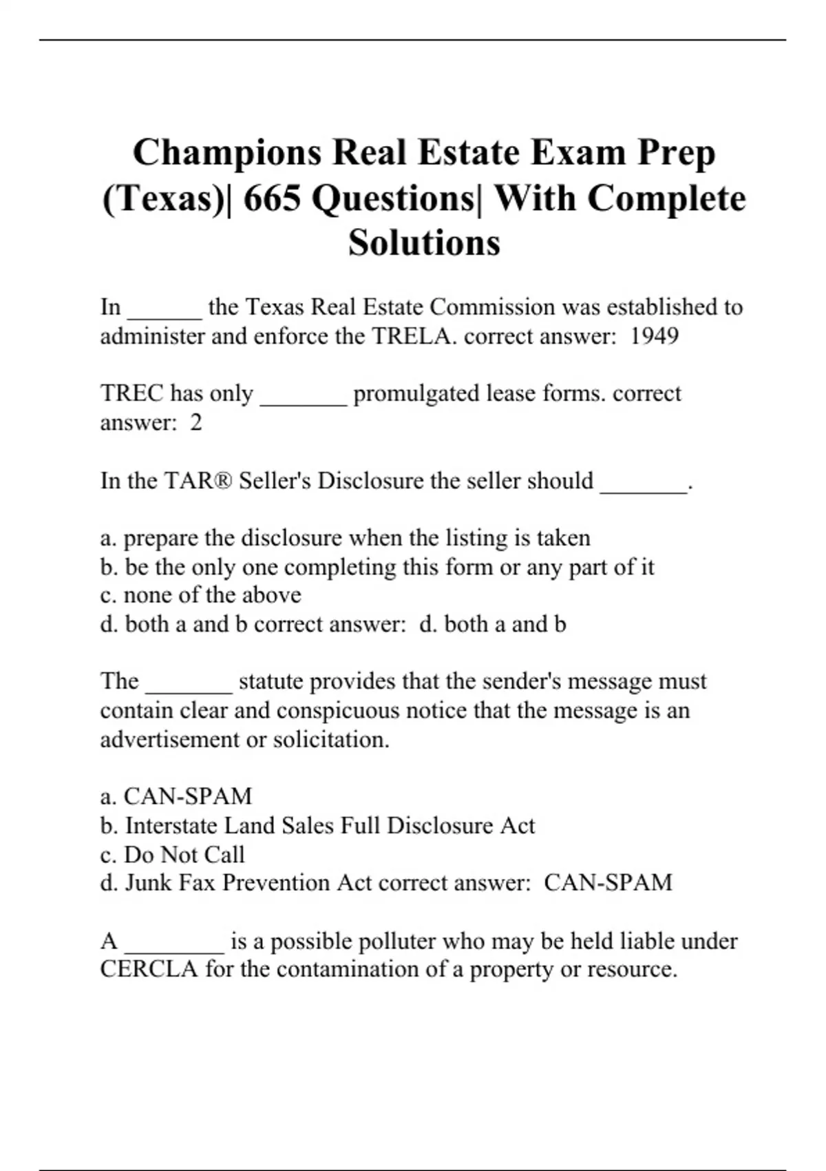 In ______ the Texas Real Estate Commission was established to administer and enforce the TRELA. correct answer: 1949 TREC has only _______ promulgated lease forms. correct answer: 2 In the TAR® Seller's Disclosure the seller should _______. a. prepare the disclosure when the listing is taken b. be the only one completing this form or any part of it c. none of the above d. both a and b correct answer: d. both a and b The _______ statute provides that the sender's message must contain clear and conspicuous notice that the message is an advertisement or solicitation. a. CAN-SPAM b. Interstate Land Sales Full Disclosure Act c. Do Not Call d. Junk Fax Prevention Act correct answer: CAN-SPAM A ________ is a possible polluter who may be held liable under CERCLA for the contamination of a property or resource. a. Safe Harbor b. EBR c. PRP d. TMARR correct answer: PRP If you hire a mold remediator he must give you a Certificate of Mold Remediation no later than ___ days after work is complete. correct answer: 10 In order to comply with the _______, contracts for the conveyance of an interest in real estate or leases for a term of