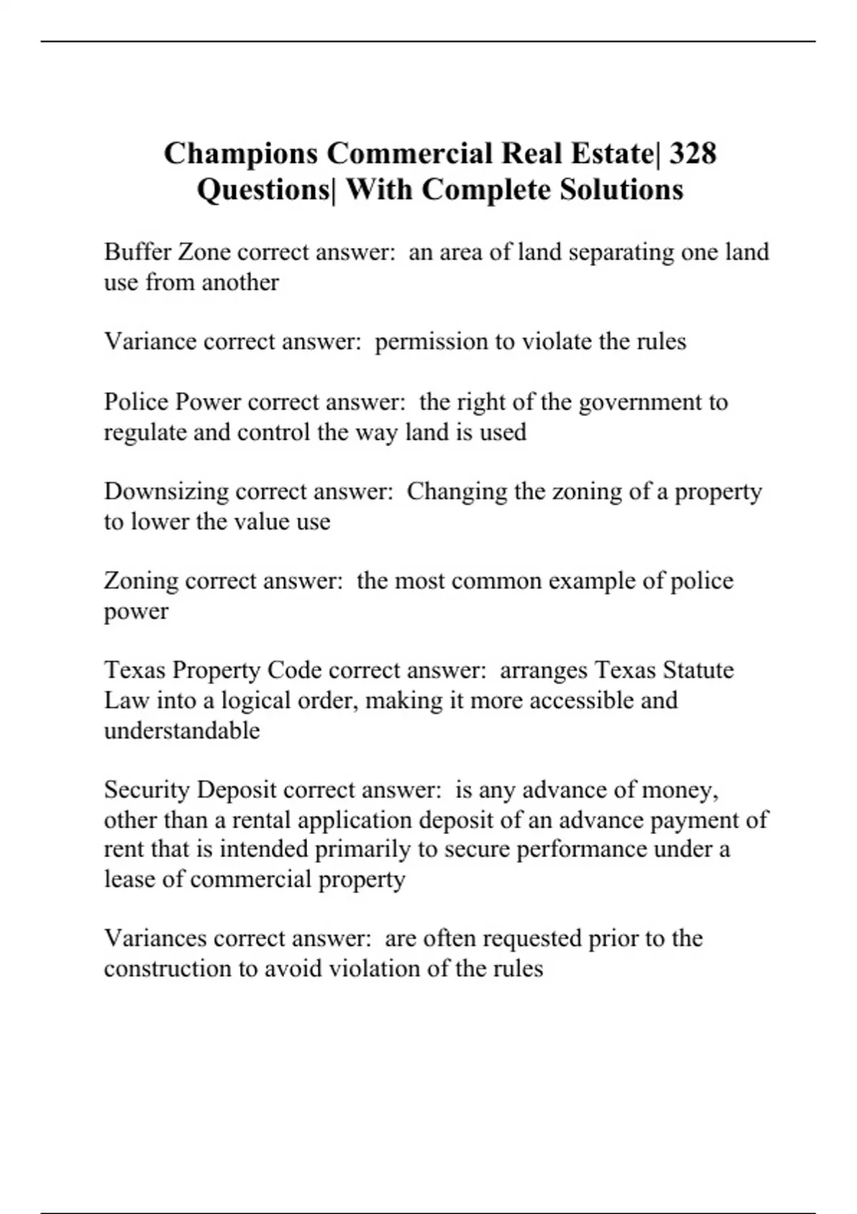 Champions Commercial Real Estate| 328 Questions| With Complete Solutions