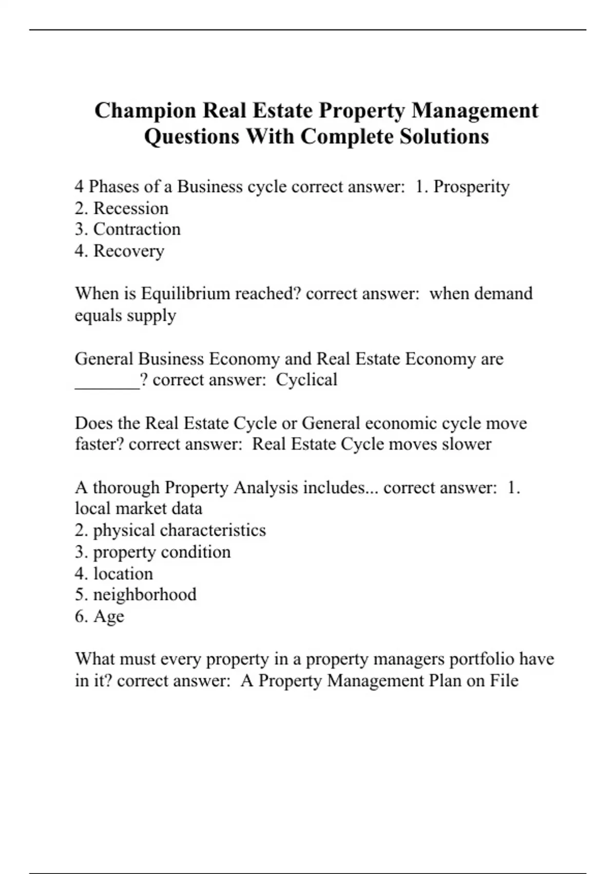 4 Phases of a Business cycle correct answer: 1. Prosperity 2. Recession 3. Contraction 4. Recovery When is Equilibrium reached? correct answer: when demand equals supply General Business Economy and Real Estate Economy are _______? correct answer: Cyclical Does the Real Estate Cycle or General economic cycle move faster? correct answer: Real Estate Cycle moves slower A thorough Property Analysis includes... correct answer: 1. local market data 2. physical characteristics 3. property condition 4. location 5. neighborhood 6. Age What must every property in a property managers portfolio have in it? correct answer: A Property Management Plan on File This ultimately determines the management plan that will be implemented? correct answer: The Goals and Objectives of the property owner Fiscal Condition Requirements correct answer: 1. 3 years worth of operating expenses 2. Current Rent Roll 3. Operating Budget Regional Analysis Includes correct answer: 1. Neighborhood Market 2. Submarkets