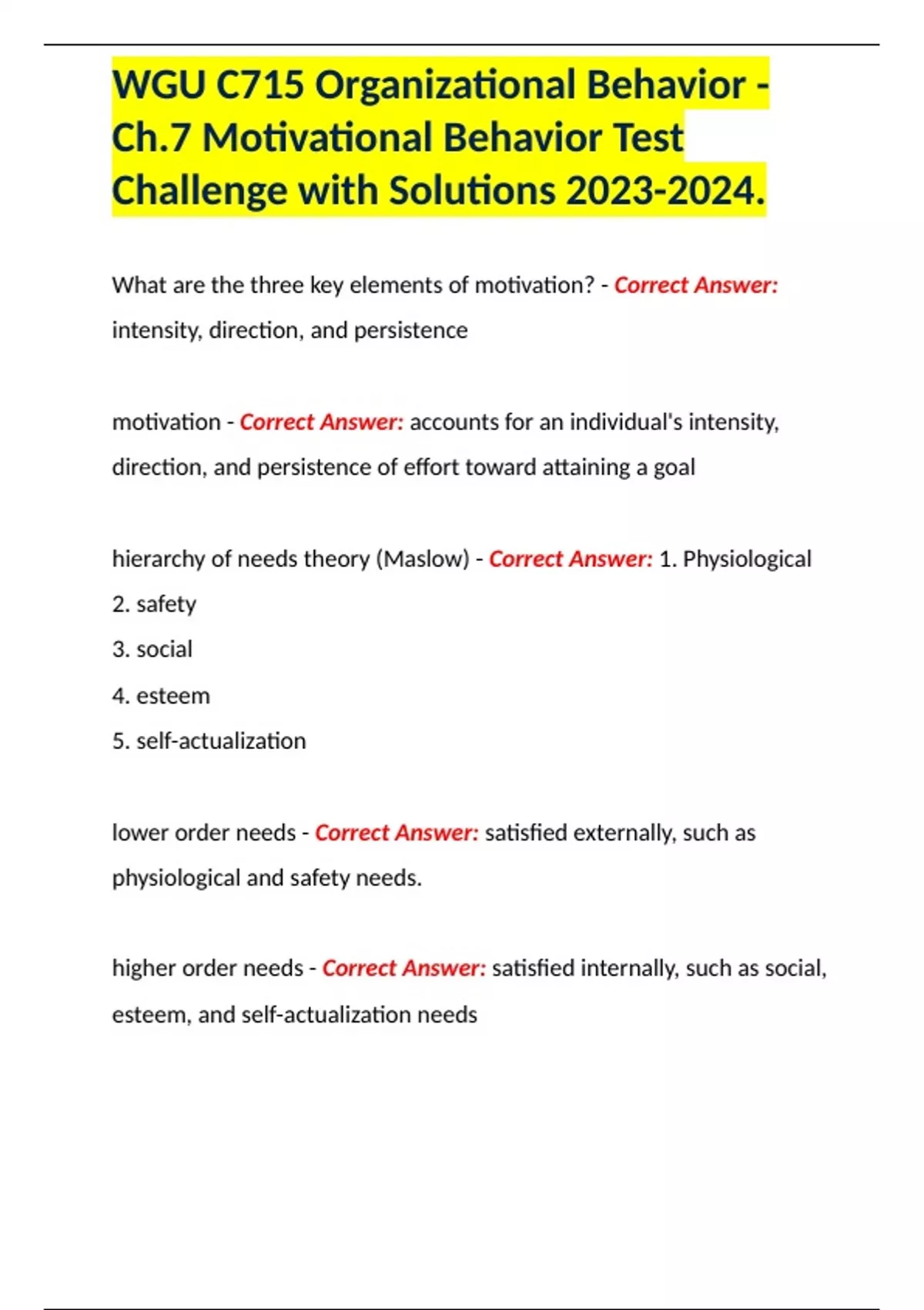 WGU C715 Organizational Behavior - Ch.7 Motivational Behavior Test Challenge with Solutions .