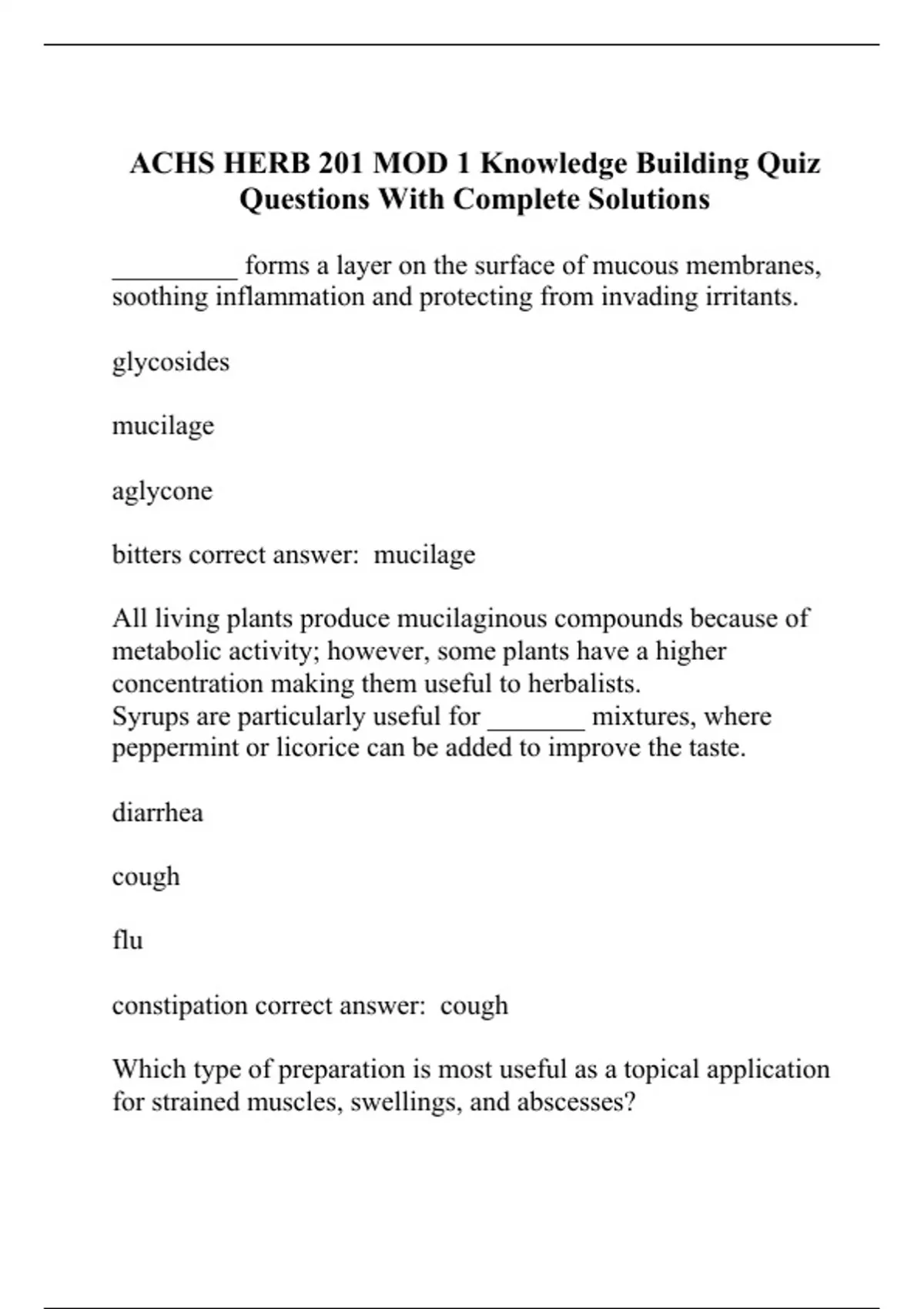 _________ forms a layer on the surface of mucous membranes, soothing inflammation and protecting from invading irritants. glycosides mucilage aglycone bitters correct answer: mucilage All living plants produce mucilaginous compounds because of metabolic activity; however, some plants have a higher concentration making them useful to herbalists. Syrups are particularly useful for _______ mixtures, where peppermint or licorice can be added to improve the taste. diarrhea cough flu constipation correct answer: cough Which type of preparation is most useful as a topical application for strained muscles, swellings, and abscesses? fomentations decoctions tinctures all of the above correct answer: fomentation Herbs contain medicinal chemical substances th