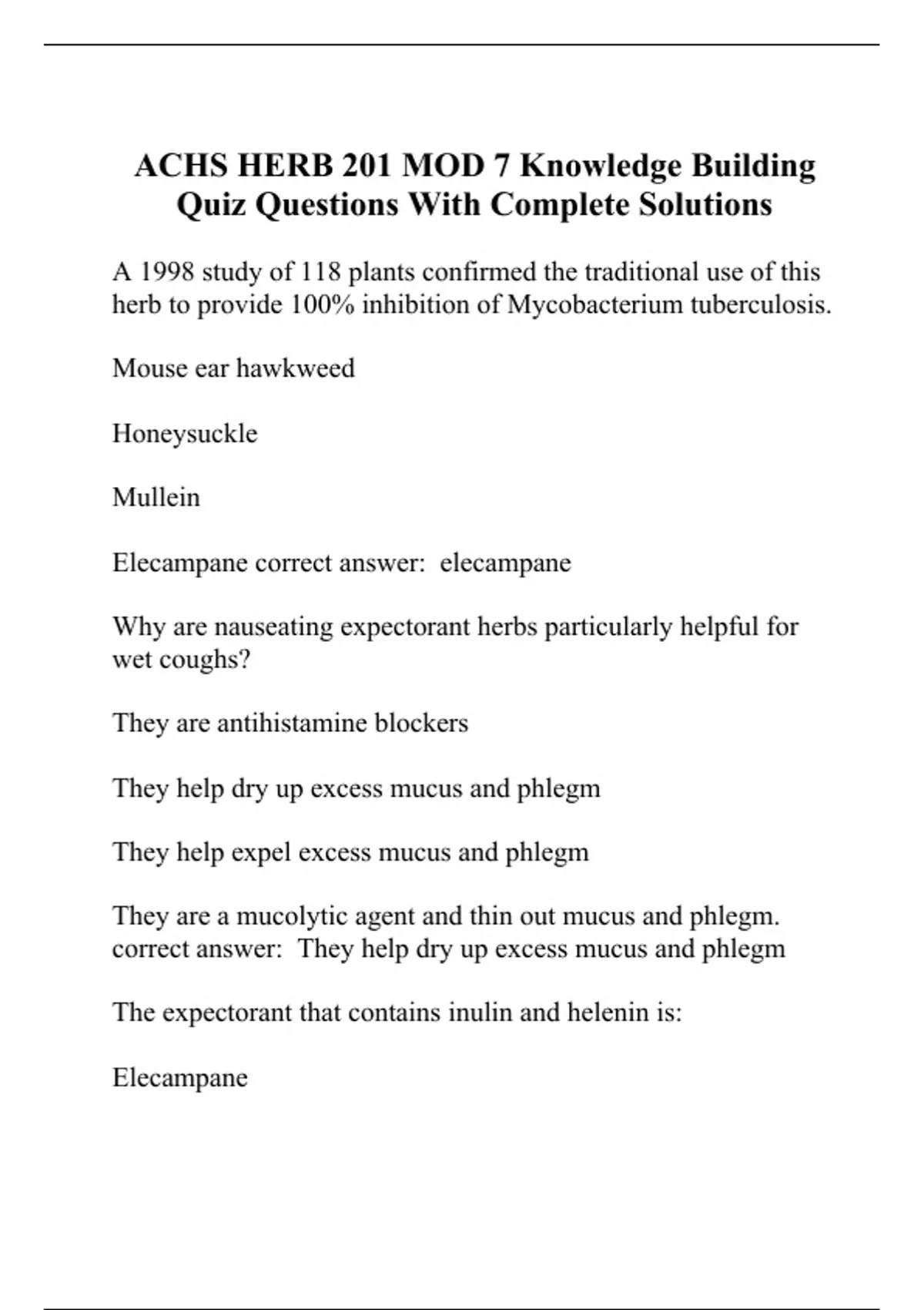 ACHS HERB 201 MOD 7 Knowledge Building Quiz Questions With Complete Solutions