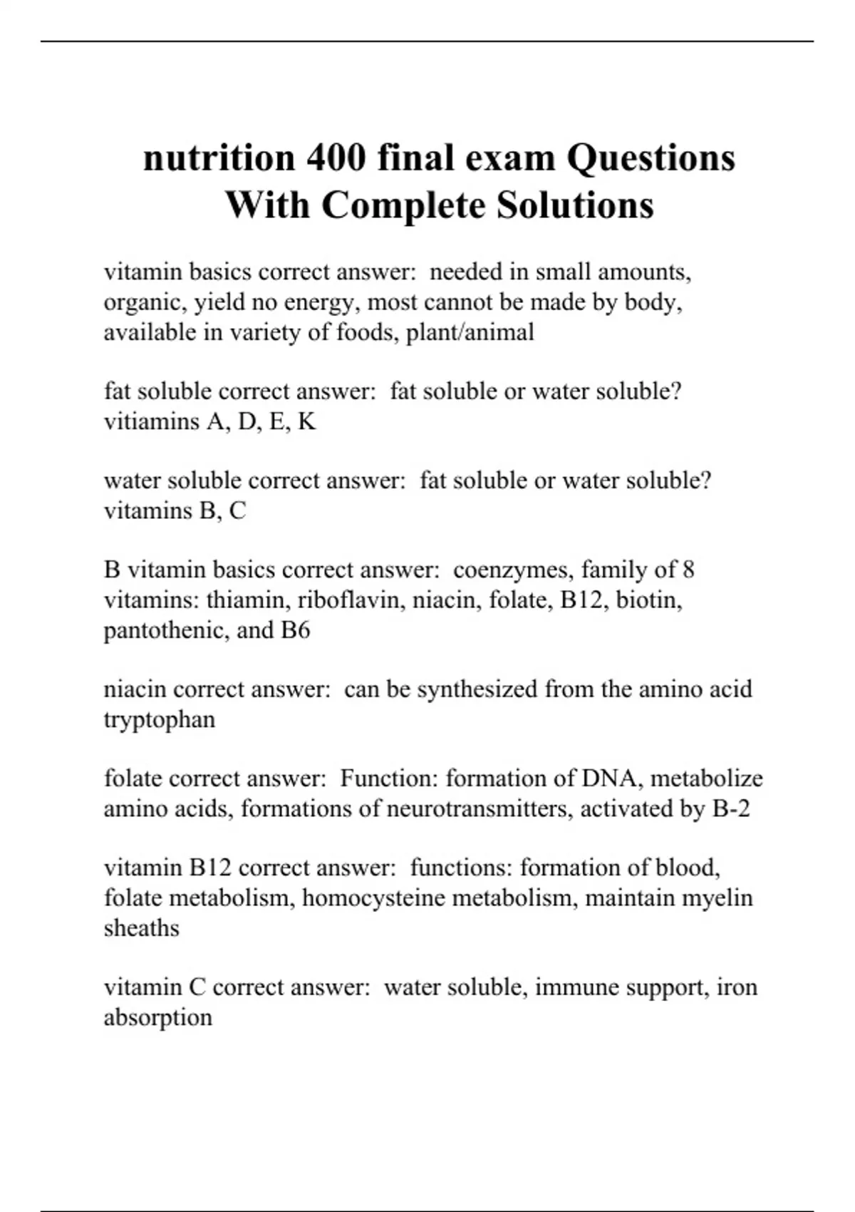 vitamin basics correct answer: needed in small amounts, organic, yield no energy, most cannot be made by body, available in variety of foods, plant/animal fat soluble correct answer: fat soluble or water soluble? vitiamins A, D, E, K water soluble correct answer: fat soluble or water soluble? vitamins B, C B vitamin basics correct answer: coenzymes, family of 8 vitamins: thiamin, riboflavin, niacin, folate, B12, biotin, pantothenic, and B6 niacin correct answer: can be synthesized from the amino acid tryptophan folate correct answer: Function: formation of DNA, metabolize amino acids, formations of neurotransmitters, activated by B-2 vitamin B12 correct answer: functions: formation of blood, folate metabolism, homocysteine metabolism, maintain myelin sheaths vitamin C correct answer: water soluble, immune support, iron absorption vitamin E correct answer: fat soluble, most active form: alpha tocopherol vitamin A correct answer: fat soluble, provitamin: sources carotenoids, preformed vitamin A: retinoids, help with eye health carotenoids correct answer: fat soluble plant pigment vitamin D correct answer: function: regulate blood ca