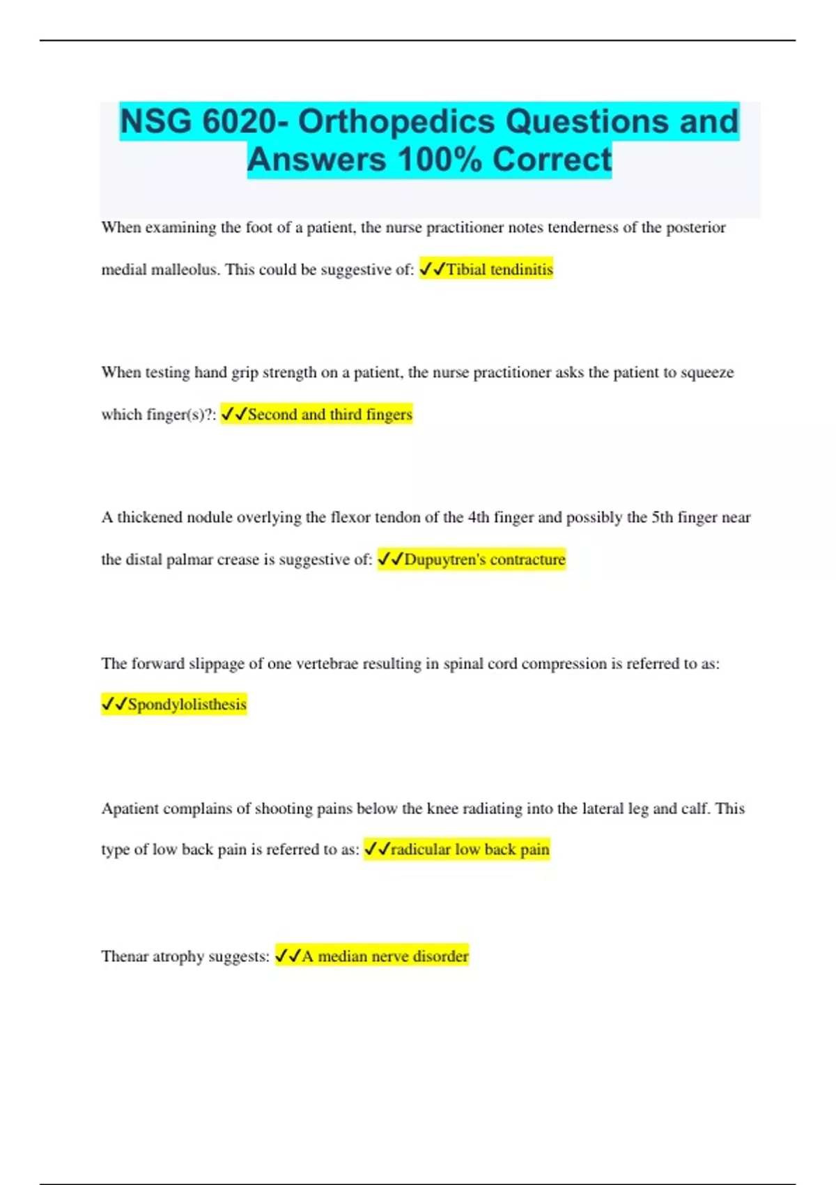 NSG 6020- Orthopedics Questions and Answers 100% Correct When examining the foot of a patient, the nurse practitioner notes tenderness of the posterior medial malleolus. This could be suggestive of: Tibial tendinitis When testing hand grip strength on a patient, the nurse practitioner asks the patient to squeeze which finger(s)?: Second and third fingers A thickened nodule overlying the flexor tendon of the 4th finger and possibly the 5th finger near the distal palmar crease is suggestive of: Dupuytren's contracture The forward slippage of one vertebrae resulting in spinal cord compression is referred to as: Spondylolisthesis Apatient complains of shooting pains below the knee radiating into the lateral leg and calf. This type of low back pain is referred to as: radicular low back pain Thenar atrophy suggests: A median nerve disorder What test is performed when the nurse practitioner instructs the patient to hold his wrists in flexion for 60 seconds while pressing back on his hands together to form right angles: phalen's test When inspecting the should and shoulder girdle, the rounded lateral aspect of the should appears flattened. This finding could be associated with: Anterior should dislocation When inspecting the shoulder and shoulder girdle, an elevation of the right should was noted this finding could be associated with: Scoliosis On examination of the foot, the nurse practitioner notes acute inflammation of the first metatarsophalangeal joint. This finding could be consistent wit h Gout Decreased spinal mobility in the lumbar region could be suggestive of: osteoarthritis When performing a musculoskeletal examination, the nurse practitioner instructs the patient to move his arm behind himself. This motion of the should girdle would be an example of: Extension Passive flexion, valgus stress, and internal rotation of the lower leg evaluate the: medial meniscus A 35 year old female patient presents to the nurse practitioner with complaints of pain in the joints of both hands accompanied by stiffness, especially in the morning with tenderness and warmth to touch. Examination reveals swelling of the synovial tissue and limitation of motion. These findings are consistent with: rheumatoid arthritis