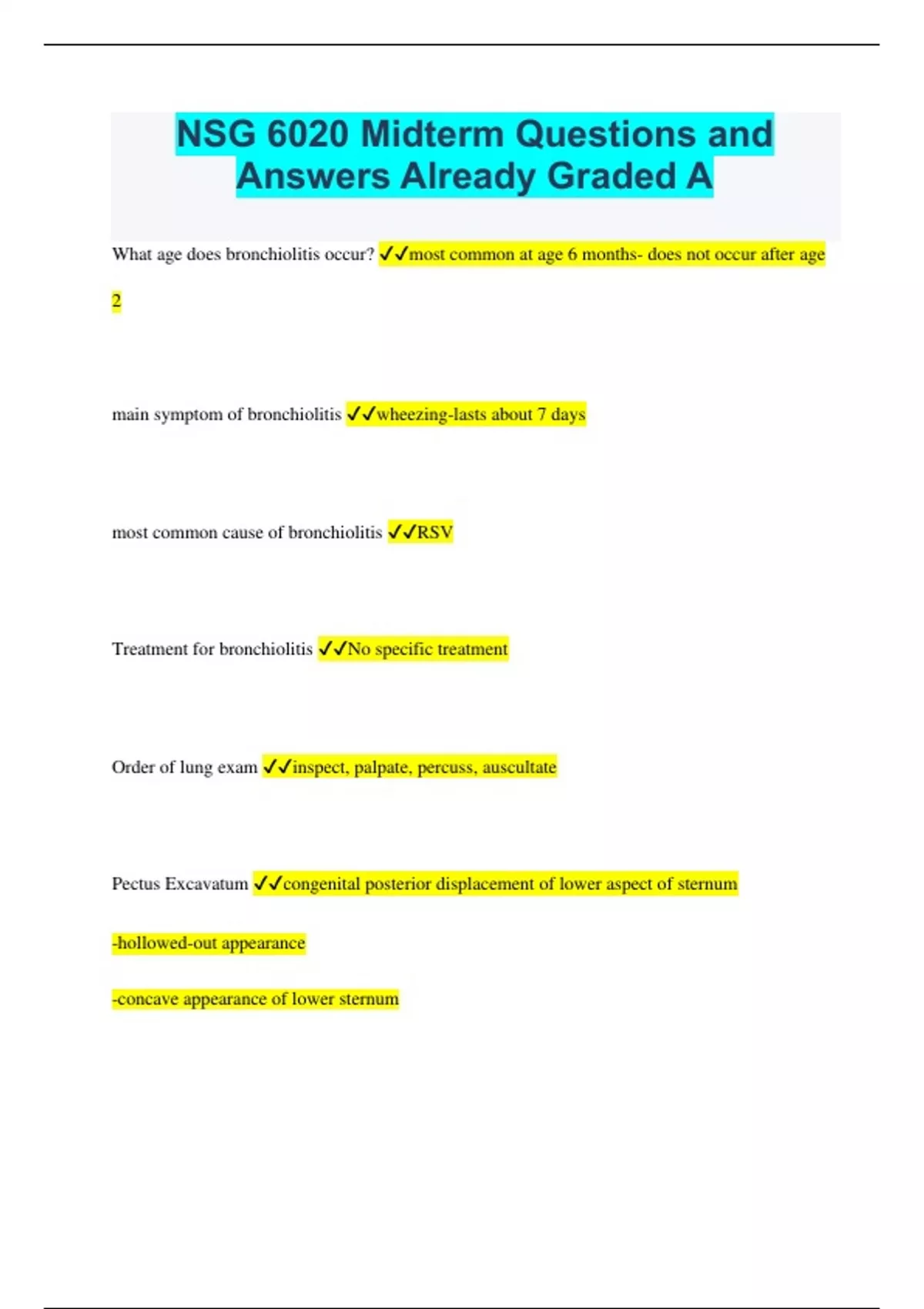 NSG 6020 Midterm Questions and Answers Already Graded A What age does bronchiolitis occur? most common at age 6 months- does not occur after age 2 main symptom of bronchiolitis wheezing-lasts about 7 days most common cause of bronchiolitis RSV Treatment for bronchiolitis No specific treatment Order of lung exam inspect, palpate, percuss, auscultate Pectus Excavatum congenital posterior displacement of lower aspect of sternum -hollowed-out appearance -concave appearance of lower sternum Pectus carinatum at birth -post CABG mid childhood and 11-14 year old pubertal males undergoing a growth spurt -convex deformity -97% have MVP Barrel Chest associated with emphysema and lung hyperinflation -accompanying x-ray demonstrates increased ant-post diameter as well as diaphragmatic flattening Tactile fremitus palpable vibrations of the bronchiopulmonary tree as the patient is speaking (99 or 1-2-3) -impeded in COPD, pulm effusion or pneumothorax -increased in consolidation and PNA percussion: flatness (thigh) Large Pleural effusion Percussion- dullness (liver) Lobar PNA Percussion: resonance (Lung) simple chronic bronchitis Percussion: hyperresonance None -emphysema, pneumothorax Percussion: tympany (gastric bubble) -large
