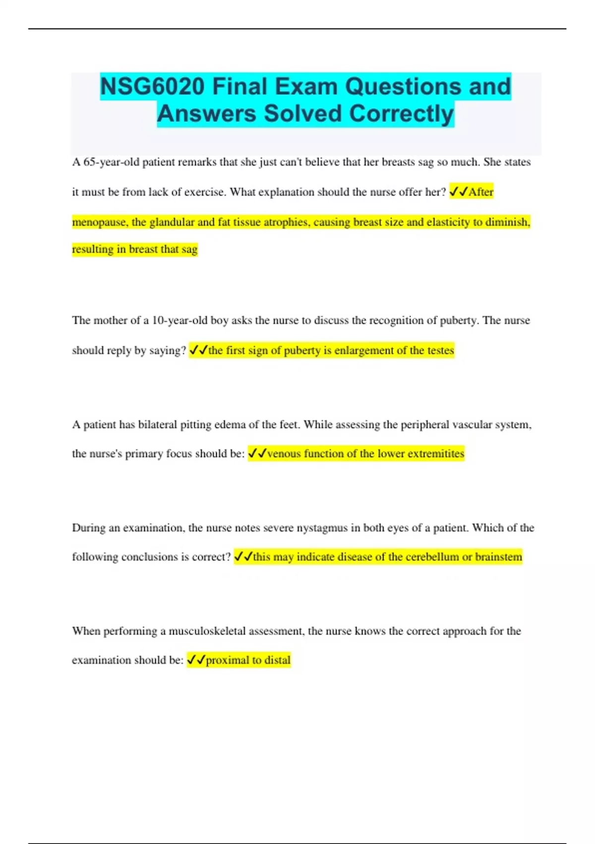 NSG6020 Final Exam Questions and Answers Solved Correctly A 65-year-old patient remarks that she just can't believe that her breasts sag so much. She states it must be from lack of exercise. What explanation should the nurse offer her? After menopause, the glandular and fat tissue atrophies, causing breast size and elasticity to diminish, resulting in breast that sag The mother of a 10-year-old boy asks the nurse to discuss the recognition of puberty. The nurse should reply by saying? the first sign of puberty is enlargement of the testes A patient has bilateral pitting edema of the feet. While assessing the peripheral vascular system, the nurse's primary focus should be: venous function of the lower extremitites During an examination, the nurse notes severe nystagmus in both eyes of a patient. Which of the following conclusions is correct? this may indicate disease of the cerebellum or brainstem When performing a musculoskeletal assessment, the nurse knows the correct approach for the examination should be: proximal to distal A 43-year-old woman is at the clinic for a routine examination. She reports that she has had a breast lump in her right breast for years. Recently, it has begun to change in consistency and is becoming harder. She reports that 5 years ago her physician evaluated the lump and determined that it "was nothing to worry about." The examination validates the presence of a mass in the right appear upper outer quadrant at 1 o'clock, approximately 5 cm form the nipple. It is frim, mobile, nontender, with borders that are not well defined. The nurse's recommendation to her is: Because of the change in consistency of the lump, it should be further evaluated by a physician The nurse practitioner is examining a 3-month-old infant. While holding the thumbs on the infant's inner-mid-thighs and the fingers outside on the hips, touching the greater trochanter, the nurse practitioner adducts the legs until the nurse practitioner's thumbs touch and then abducts the legs until the infant's knees touch the table. The nurse practitioner does not note any "clunking" sounds and is confident to record a: Negative Ortolani's sign A patient's mother has noticed that her son, who has been to a new babysitter, has some blisters and scabs on his face and buttocks. On examination, the nurse notices moist, thin-roofed vesicles with a thin erythematous base and suspects: Impetigo The nurse is testing superficial reflexes on an adult patient. When stroking up the lateral side of the sole and across the ball of the foot, the nurse notices the