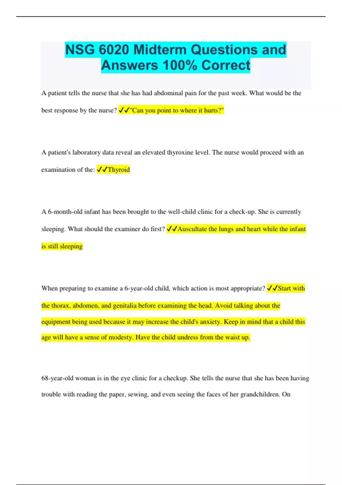 NSG 6020 Midterm Questions and Answers 100% Correct A patient tells the nurse that she has had abdominal pain for the past week. What would be the best response by the nurse? "Can you point to where it hurts?" A patient's laboratory data reveal an elevated thyroxine level. The nurse would proceed with an examination of the: Thyroid A 6-month-old infant has been brought to the well-child clinic for a check-up. She is currently sleeping. What should the examiner do first? Auscultate the lungs and heart while the infant is still sleeping When preparing to examine a 6-year-old child, which action is most appropriate? Start with the thorax, abdomen, and genitalia before examining the head. Avoid talking about the equipment being used because it may increase the child's anxiety. Keep in mind that a child this age will have a sense of modesty. Have the child undress from the waist up. 68-year-old woman is in the eye clinic for a checkup. She tells the nurse that she has been having trouble with reading the paper, sewing, and even seeing the faces of her grandchildren. On examination, the nurse notes that she has some loss of central vision but her peripheral vision is normal. These findings suggest that: She may have macular degeneration In assessing a patient's major risk factors for heart disease, which would the nurse want to include when taking a history? 1.Family history, hypertension, stress, age 2.Personality type, high cholesterol, diabetes, smoking 3.Smoking, hypertension, obesity, diabetes, high cholesterol 4.Alcohol consumption, obesity, diabetes, stress, high cholesterol 3. Smoking, hypertension, obesity, diabetes, high cholesterol A teenage patient comes to the emergency department with complaints of an inability to breathe and a sharp pain in the left side of his chest. The assessment findings include cyanosis, tachypnea, tracheal deviation to the right, decreased tactile fremitus on the left, hyperresonance on the left, and decreased breath sounds on the left. The nurse interprets that these assessment findings are consistent with: a pneumothorax During a hearing assessment the nurse practitioner finds that sound lateralizes to the patient's left ear with the Weber test. What can the nurse practitioner conclude from this? The patient has a conductive hearing loss in the right ear. Lateralization is a normal finding with the Weber test. The patient could have either a sensorineural or a conductive loss. A mistake has occurred; the test must be repeated. The most important reason to share information and offer brief teaching while performing the physical examination is to help: examiner feel more comfortable and gain control of the situation. rapport and increase the patient's confidence in the examiner. patient understand his or her disease process and treatment modalities. patient identify questions about his or her disease and potential areas of patient education. 2. build rapport and increase the patient's confidence in