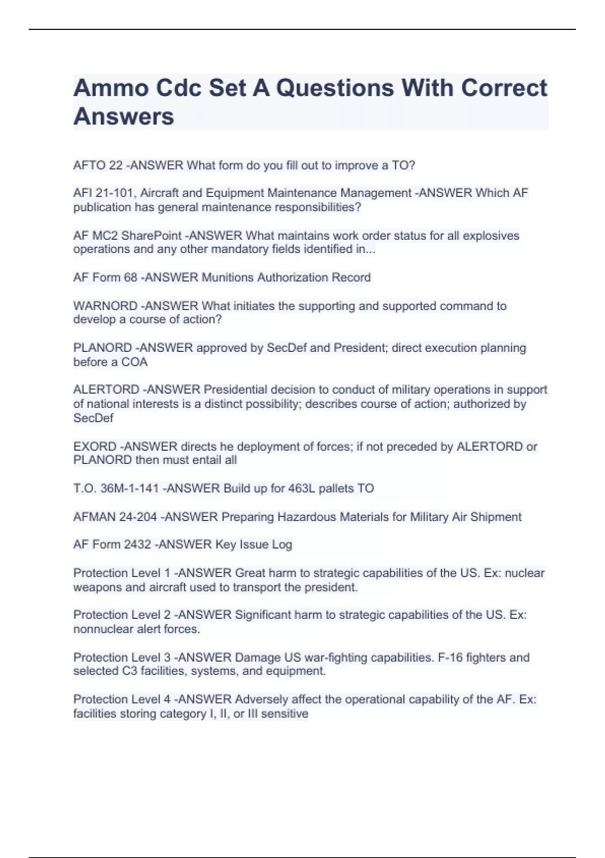 AFTO 22 -ANSWER What form do you fill out to improve a TO? AFI 21-101, Aircraft and Equipment Maintenance Management -ANSWER Which AF publication has general maintenance responsibilities? AF MC2 SharePoint -ANSWER What maintains work order status for all explosives operations and any other mandatory fields identified in... AF Form 68 -ANSWER Munitions Authorization Record WARNORD -ANSWER What initiates the supporting and supported command to develop a course of action? PLANORD -ANSWER approved by SecDef and President; direct execution planning before a COA ALERTORD -ANSWER Presidential decision to conduct of military operations in support of national interests is a distinct possibility; describes course of action; authorized by SecDef EXORD -ANSWER directs he deployment of forces; if not preceded by ALERTORD or PLANORD then must entail all T.O. 36M-1-141 -ANSWER Build up Ammo Cdc Set A Questions With Correct Answers