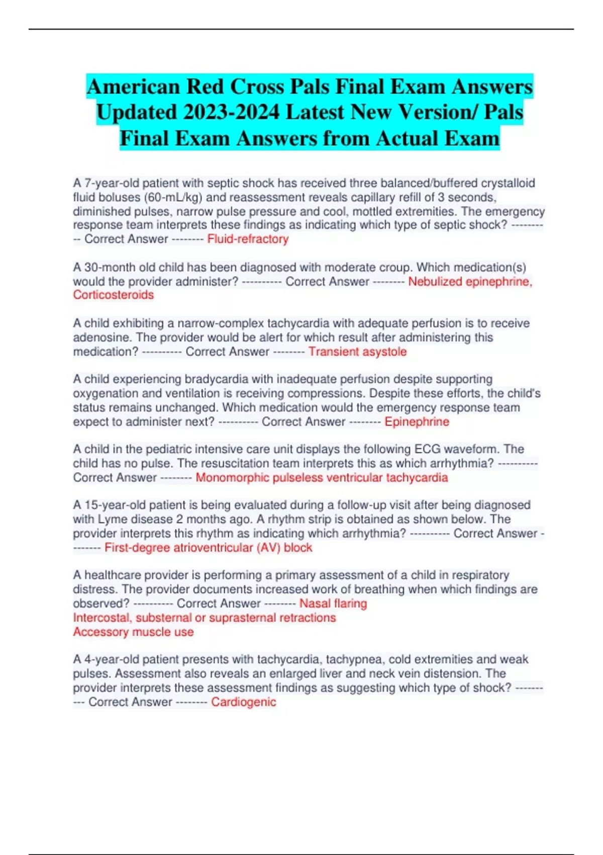 American Red Cross Pals Final Exam Answers Updated Latest New Version/ Pals Final Exam Answers from Actual Exam