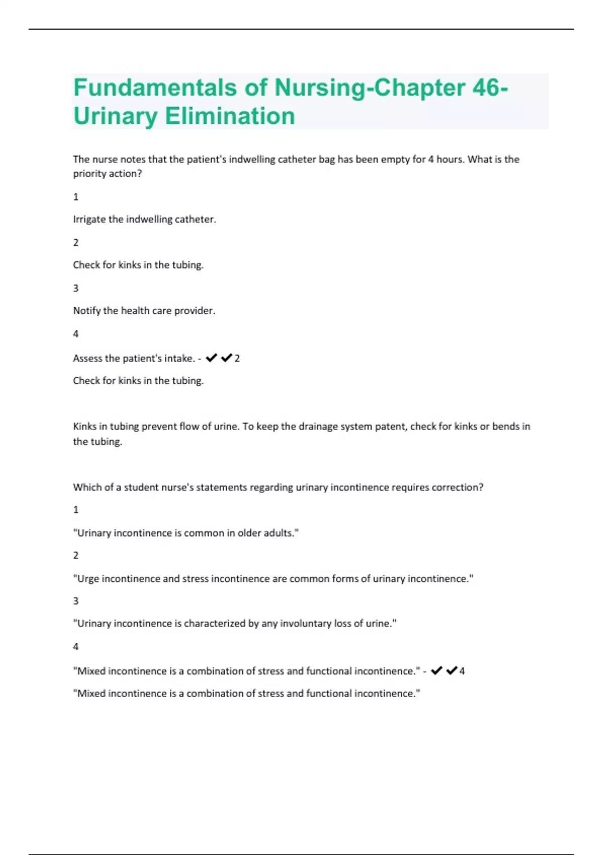 The nurse notes that the patient's indwelling catheter bag has been empty for 4 hours. What is the priority action? 1 Irrigate the indwelling catheter. 2 Check for kinks in the tubing. 3 Notify the health care provider. 4 Assess the patient's intake. - 2 Check for kinks in the tubing. Kinks in tubing prevent flow of urine. To keep the drainage system patent, check for kinks or bends in the tubing. Which of a student nurse's statements regarding urinary incontinence requires correction? 1 "Urinary incontinence is common in older adults." 2 "Urge incontinence and stress incontinence are common forms of urinary incontinence." 3 "Urinary incontinence is characterized by any involuntary loss of urine." 4 "Mixed incontinence is a combination of stress and functional incontinence." - 4 "Mixed incontinence is a combination of stress and functional incontinence."Mixed incontinence is a combination of stress and urge, not functional, incontinence. Urinary incontinence is common in older adults. Urge incontinence and stress incontinence are common forms of urinary incontinence that are characterized by any involuntary loss of urine. What is the correct amount space allowed between the tip of the penis and the end of the catheter while placing a condom catheter on a patient? 1 1.5 to 3 cm 2 2.5 to 5 cm 3 3.5 to 5 cm 4 4.5 to 6 cm - 2 2.5 to 5 cm While placing a condom catheter on the patient, the nurse should allow a space of 2.5 to 5 cm (1 to 2 inches) between the tip of the penis and the end of the catheter. Patients with which type of urinary incontinence can be at risk for severe elevation of blood pressure, pulse rate and diaphoresis? 1 Functional incontinence 2 Stress urinary incontinence 3 Reflex urinary incontinence 4 Urge urinary incontinence - 3 Reflex urinary incontinence