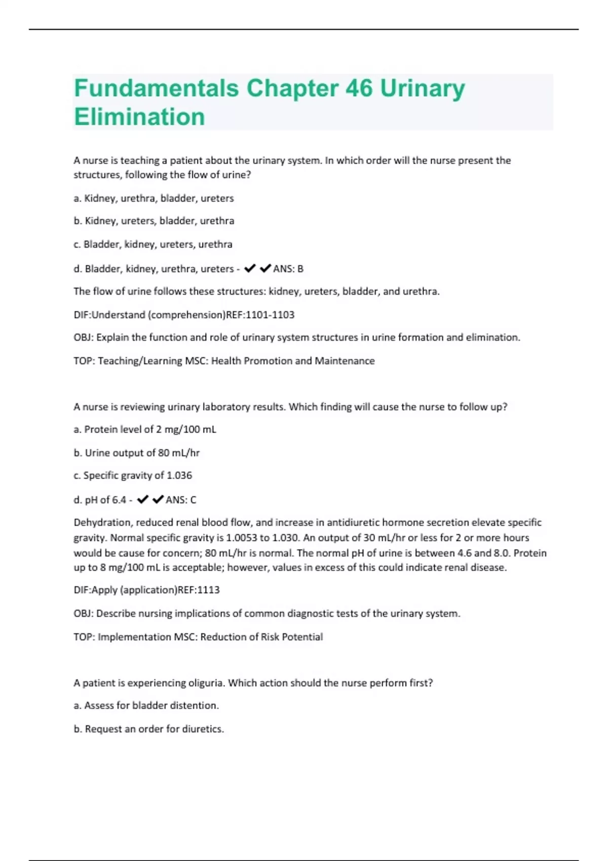 A nurse is teaching a patient about the urinary system. In which order will the nurse present the structures, following the flow of urine? a. Kidney, urethra, bladder, ureters b. Kidney, ureters, bladder, urethra c. Bladder, kidney, ureters, urethra d. Bladder, kidney, urethra, ureters - ANS: B The flow of urine follows these structures: kidney, ureters, bladder, and urethra. DIF:Understand (comprehension)REF: OBJ: Explain the function and role of urinary system structures in urine formation and elimination. TOP: Teaching/Learning MSC: Health Promotion and Maintenance A nurse is reviewing urinary laboratory results. Which finding will cause the nurse to follow up? a. Protein level of 2 mg/100 mL b. Urine output of 80 mL/hr c. Specific gravity of 1.036 d. pH of 6.4 - ANS: C Dehydration, reduced renal blood flow, and increase in antidiuretic hormone secretion elevate specific gravity. Normal specific gravity is 1.0053 to 1.030. An output of 30 mL/hr or less for 2 or more hours would be cause for concern; 80 mL/hr is normal. The normal pH of urine is between 4.6 and 8.0. Protein up to 8 mg/100 mL is acceptable; however, values in excess of this could indicate renal disease. DIF:Apply (application)REF:1113 OBJ: Describe nursing implications of common diagnostic tests of the urinary system. TOP: Implementation MSC: Reduction of Risk Potential A patient is experiencing oliguria. Which action should the nurse perform first? a. Assess for bladder distention. b. Request an order for diuretics.c. Increase the patient's intravenous fluid rate. d. Encourage the patient to drink caffeinated beverages. - ANS: A