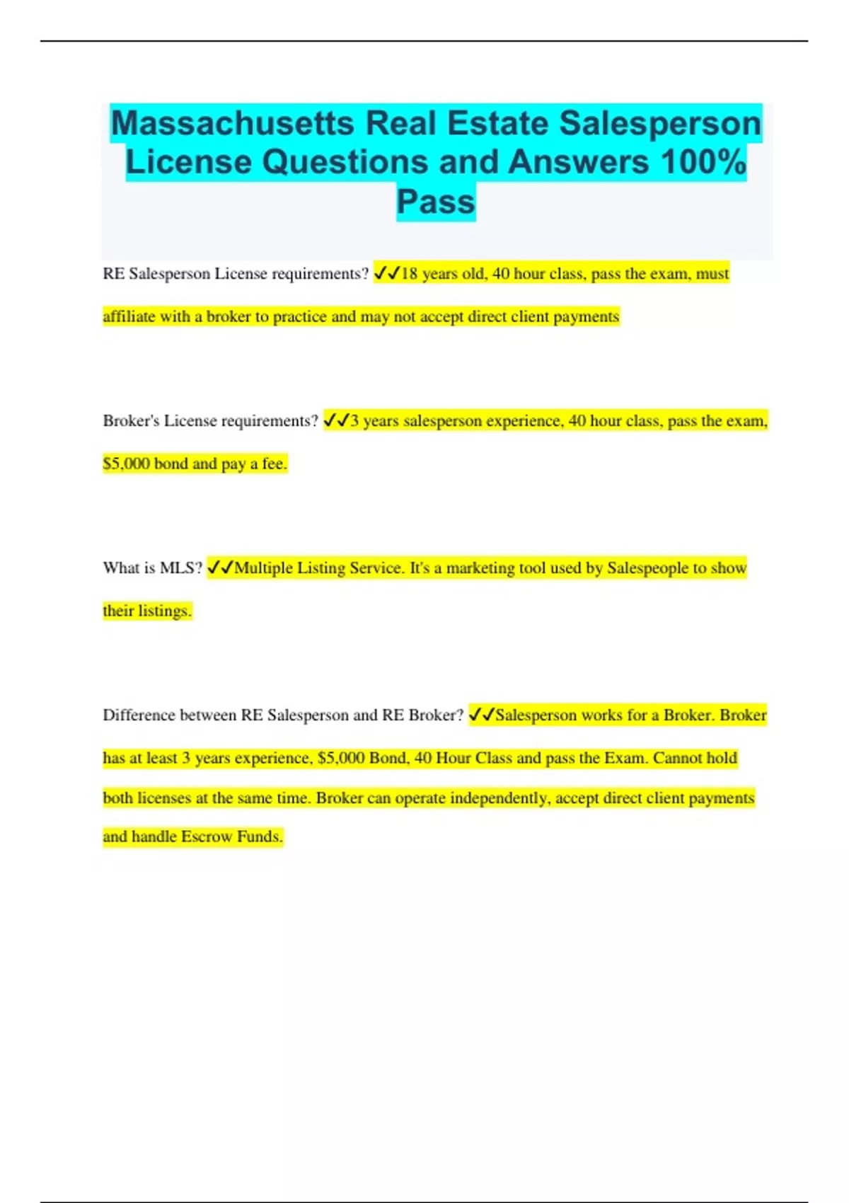 Massachusetts Real Estate Salesperson License Questions and Answers 100% Pass