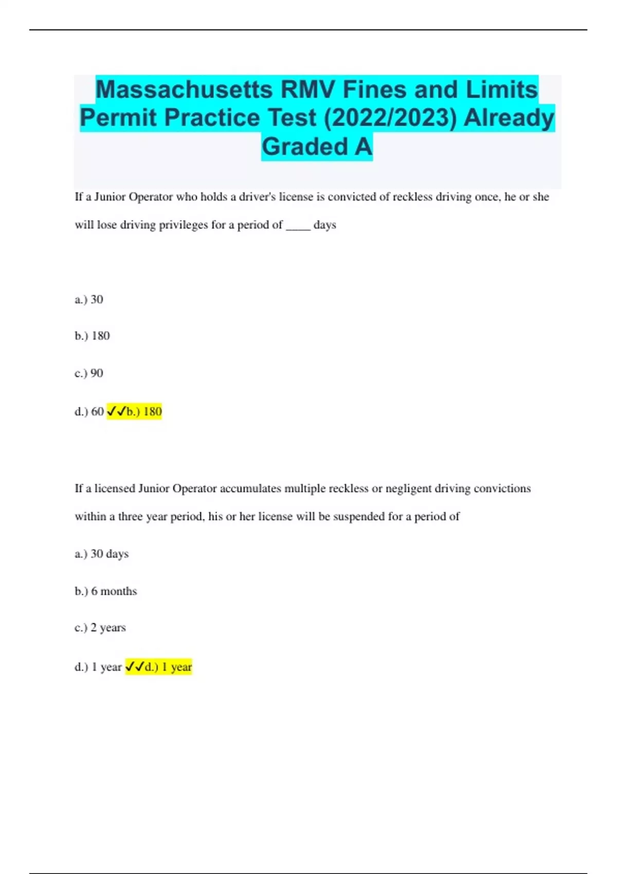 Massachusetts RMV Fines and Limits Permit Practice Test (2022/2023) Already Graded A