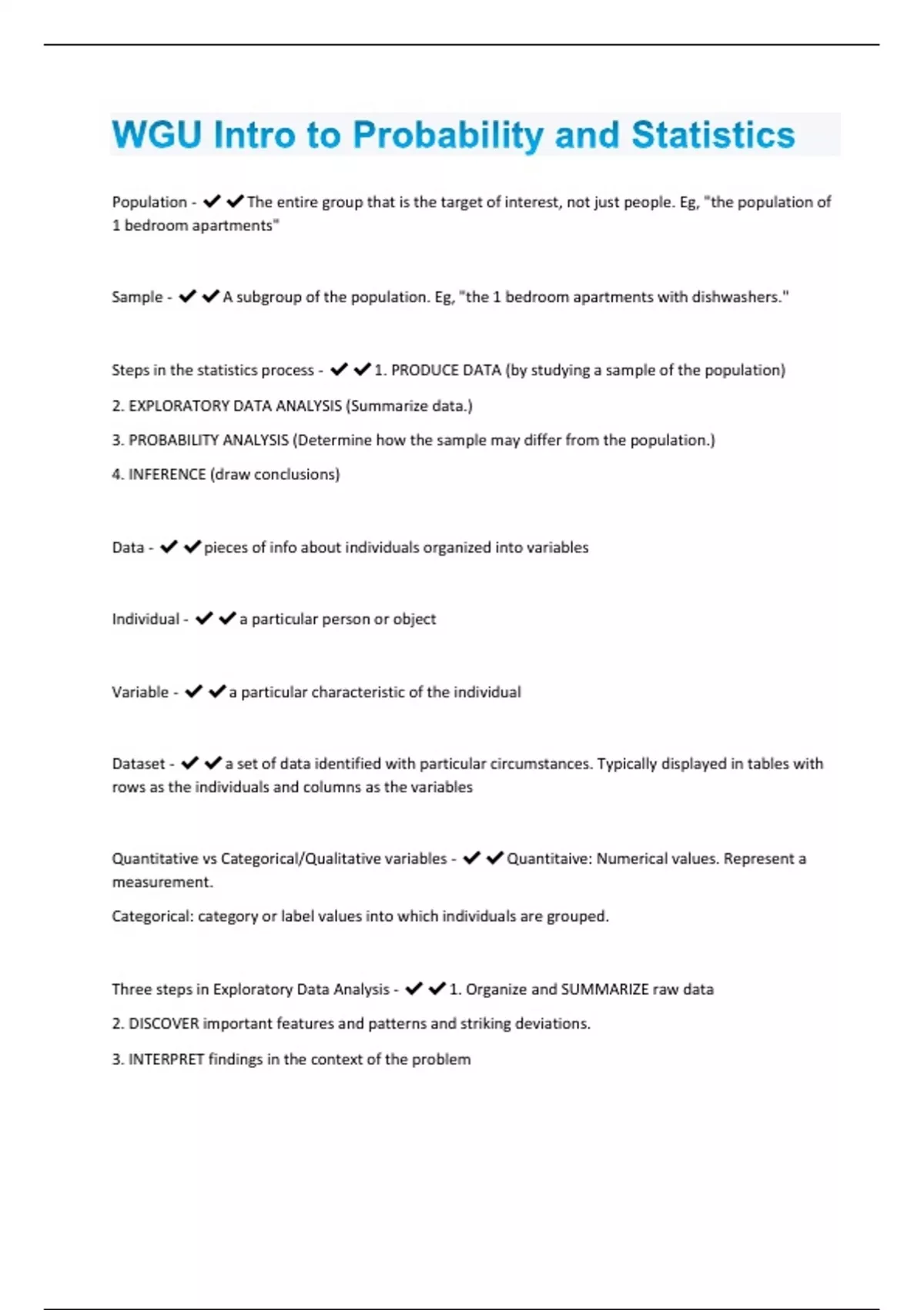 Population - The entire group that is the target of interest, not just people. Eg, "the population of 1 bedroom apartments" Sample - A subgroup of the population. Eg, "the 1 bedroom apartments with dishwashers." Steps in the statistics process - 1. PRODUCE DATA (by studying a sample of the population) 2. EXPLORATORY DATA ANALYSIS (Summarize data.) 3. PROBABILITY ANALYSIS (Determine how the sample may differ from the population.) 4. INFERENCE (draw conclusions) Data - pieces of info about individuals organized into variables Individual - a particular person or object Variable - a particular characteristic of the individual Dataset - a set of data identified with particular circumstances. Typically displayed in tables with rows as the individuals and columns as the variables Quantitative vs Categorical/Qualitative variables - Quantitaive: Numerical values. Represent a measurement. Categorical: category or label values into which individuals are grouped. Three steps in Exploratory Data Analysis - 1. Organize and SUMMARIZE raw data 2. DISCOVER important features and patterns and striking deviations. 3. INTERPRET findings in the context of the problemExamining Distributions - exploring data obtained from one variable at a time Examining Relationships - exploring data obtained from two variables at a time Distribution - what values the variable takes, how often Three types of graphical displays of categorical distributions - 1. Pie Charts 2. Bar Charts 3. Pictogram Bins - ranges of data to make charting easier, like a bar chart where each bar shows a range like 70-80% Numerical Summaries - category counts and percentages Four types of Graphical displays of Quantitative Variables - 1. Histogram 2. Stemplot 3. Dotplot 4. Boxplot Histogram - like a bar chart but the x axis is numerical, in order. Eg: x axis is years, y axis is Men's income and Women's income. Or, the x axis is number of hours studied, and y axis is number of students falling into each number of hours studied category.