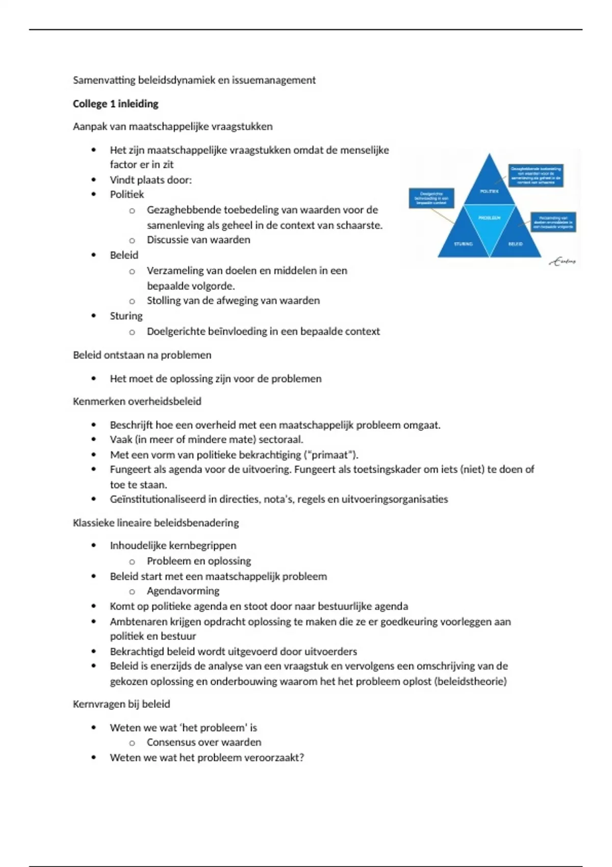 Samenvatting van het vak Beleidsdynamiek en Issue management van de master Beleid en politiek aan de Erasmus Universiteit. OOK VAN TOEPASSING VOOR DE MASTER COMPLEXE SYSTEMEN. Voor master complexe systemen komen 6 van de 8 colleges overeen.