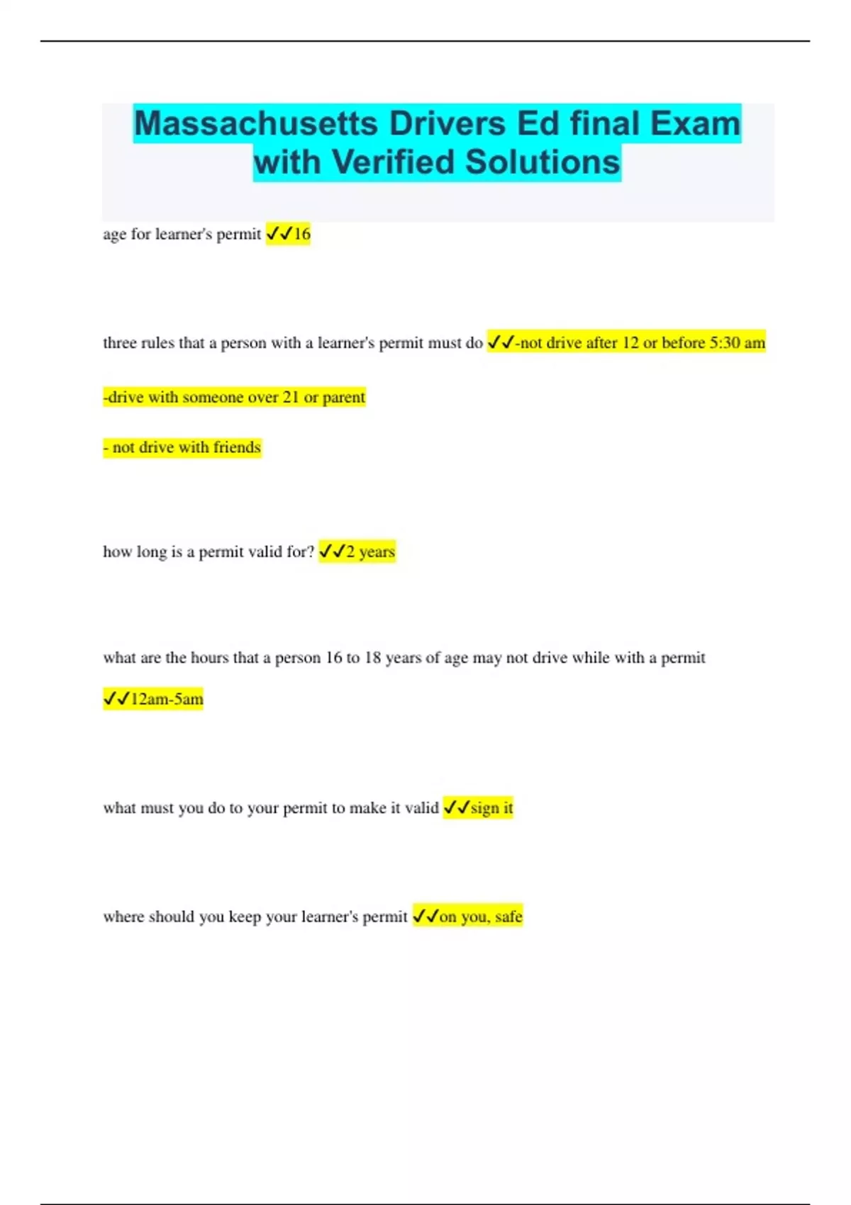 Massachusetts Drivers Ed final Exam with Verified Solutions
