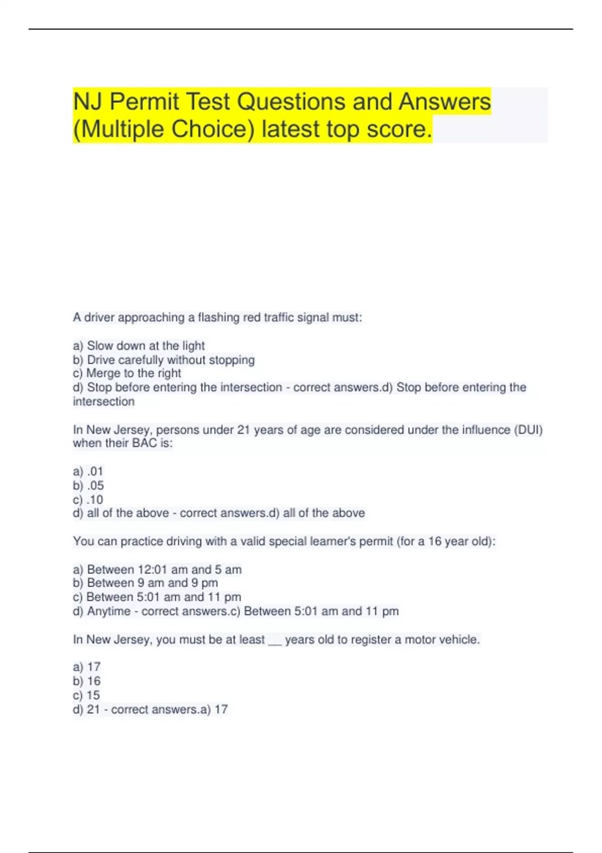 NJ Permit Test Questions and Answers (Multiple Choice) latest top score. A driver approaching a flashing red traffic signal must: a) Slow down at the light b) Drive carefully without stopping c) Merge to the right d) Stop before entering the intersection - correct answers.d) Stop before entering the intersection In New Jersey, persons under 21 years of age are considered under the influence (DUI) when their BAC is: a) .01 b) .05 c) .10 d) all of the above - correct answers.d) all of the above You can practice driving with a valid special learner's permit (for a 16 year old): a) Between 12:01 am and 5 am b) Between 9 am and 9 pm c) Between 5:01 am and 11 pm d) Anytime - correct answers.c) Between 5:01 am and 11 pm In New Jersey, you must be at least __ years old to register a motor vehicle. a) 17 b) 16 c) 15 d) 21 - correct answers.a) 17 As you drive, you are required to stop your vehicle: a) At an intersection with a stop sign b) Where there is a red light c) When a traffic officer orders you to stop d) All of the above - correct answers.d) All of the above As you drive, you must turn your headlights on: a) When you turn your wipers on b) One-half hour after sunset c) One-half hour before sunrise d) All of the above - correct answers.d) All of the above You must yield for emergency vehicles: a) Never b) When you see a flashing red or blue light or hear a siren c) Only when other vehicles yield d) None of the above - correct answers.b) When you see a flashing red or blue light or hear a siren You may drive on public or private property to avoid a traffic sign or signal only: a) If the driver stops the vehicle before crossing the sidewalk b) With the permission of the property owner c) Anytime d) When directed to do so by a police officer - correct answers.d) When directed to do so by a police officer It is important to slow down: a) On narrow or winding roads b) At intersections or railroad crossings c) When the road is wet or slippery d) All of the above - correct answers.d) All of the above Vehicle stopping distances never depend on: a) Your own reaction time b) Time of day c) Condition of your vehicle's brakes c) Condition and type of vehicle's tires - correct answers.b) Time of day You needn't stop your vehicle for an ice cream truck when: a) It shows flashing red lights b) It shows a stop signal arm c) A person is crossing the roadway to or from the frozen dessert truck d) On a dual highway if you're on the other side of a safety islands or median from the ice cream truck - correct answers.d) On a dual highway if you're on the other side of a safety islands or median from the ice cream truck When driving on major highways: a) Stay alert b) Keep your eyes moving c) Be ready to react to road hazards d) All of the above - correct answers.d) All of the above When driving in bad weather, drivers should: a) Increase speed to reach the final destination more quickly b) Decrease the "two-second" rule c) Increase the "two-second" rule d) None of the above - correct answers.c) Increase the "two-second" rule MVC may terminate your road test before it starts because of: a) An unsafe vehicle b) A center console or other equipment in your vehicle that obstructs the examiner's access to the brake pedal c) Missing seat belts d) All of the above - correct answers.d) All of the above The Implied Consent Law is: a) Permission for someone to drive your vehicle b) All passengers must wear their seat belts c) You agree to a breath test when under arrest and suspected of drinking and driving d) None of the above - correct answers.c) You agree to a breath test when under arrest and suspected of drinking and driving If a collision is possible, you should: a) Choose to hit something that will give way rather than something that's rigid b) Choose to hit something that's standing still rather than something moving toward you c) If you have to hit anything, try to make it a glancing blow or sideswipe d) All of the above - correct answers.d) All of the above if your windshield wipers stop suddenly during rain or snow you should: a) Slow down b) Roll down the driver's side window and put your head out so you can see ahead c) Brake and pull off the road d) All of the above - correct answers.d) All of the above What are some telltale signs of a drunk driver? a) Weaving between lanes b) Driving slower than normal traffic flow c) Quick and sudden stops d) All of the above - correct answers.d) All of the above A 5-ounce glass of wine contains the same amount of alcohol as: a) One pint of whiskey b) A gallon of wine c) A 6-pack of beer d) One 12-ounce can of beer - correct answers.d) One 12-ounce can of beer To obtain a New Jersey driver license or non-driver ID card, you must present: a) Proof of age b) Proof of address c) Proof of legal US presence d) All of the above - correct answers.d) All of the above If you are driving behind a school bus and it shows a flashing red light signaling a stop, you must: a) Stop at least 25 feet away b) Slow down to 10 mph c) Speed up and pass d) Stop directly behind the bus - correct answers.a) Stop at least 25 feet away If you move to New Jersey, how long do you have to transfer your basic driver license? a) 7 days or until your out-of-state driver license expires, whichever comes first b) 14 days or until your out-of-state driver license expires, whichever comes first c) 30 days or until your out-of-state driver license expires, whichever comes first d) 60 days or until your out-of-state driver license expires, whichever comes first - correct answers.d) 60 days or until your out-of-state driver license expires, whichever comes first Getting a driver's license illegally may result in: a) A fine of $25 to $100 b) Imprisonment of 6 months c) A court trial d) A fine of $200 to $500 and/or imprisonment from 30 to 90 days - correct answers.d) A fine of $200 to $500 and/or imprisonment from 30 to 90 days If a student fails the driving test (road test) for the first time, how long must he/