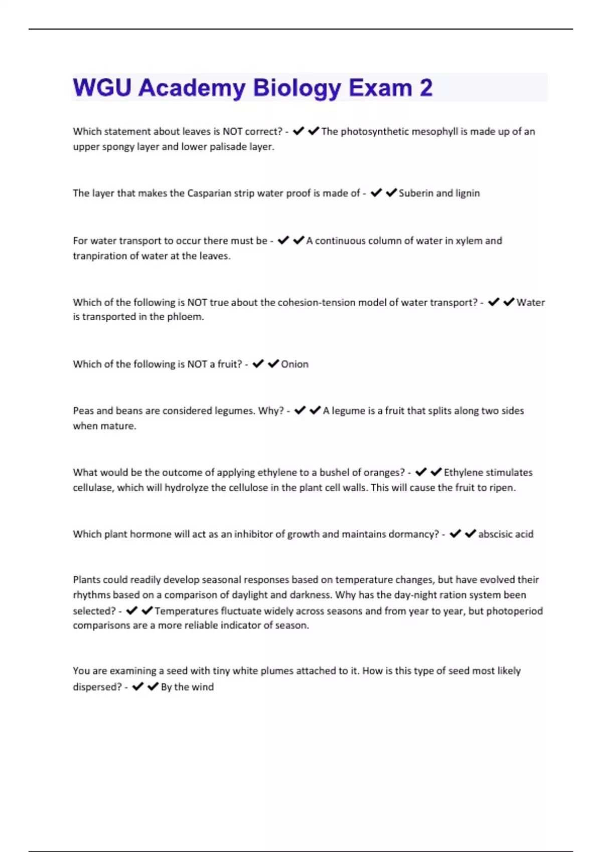 Which statement about leaves is NOT correct? - The photosynthetic mesophyll is made up of an upper spongy layer and lower palisade layer. The layer that makes the Casparian strip water proof is made of - Suberin and lignin For water transport to occur there must be - A continuous column of water in xylem and tranpiration of water at the leaves. Which of the following is NOT true about the cohesion-tension model of water transport? - Water is transported in the phloem. Which of the following is NOT a fruit? - Onion Peas and beans are considered legumes. Why? - A legume is a fruit that splits along two sides when mature. What would be the outcome of applying ethylene to a bushel of oranges? - Ethylene stimulates cellulase, which will hydrolyze the cellulose in the plant cell walls. This will cause the fruit to ripen. Which plant hormone will act as an inhibitor of growth and maintains dormancy? - abscisic acid Plants could readily develop seasonal responses based on temperature changes, but have evolved their rhythms based on a comparison of daylight and darkness. Why has the day-night ration system been selected? - Temperatures fluctuate widely across seasons and from year to year, but photoperiod comparisons are a more reliable indicator of season. You are examining a seed with tiny white plumes attached to it. How is this type of seed most likely dispersed? - By