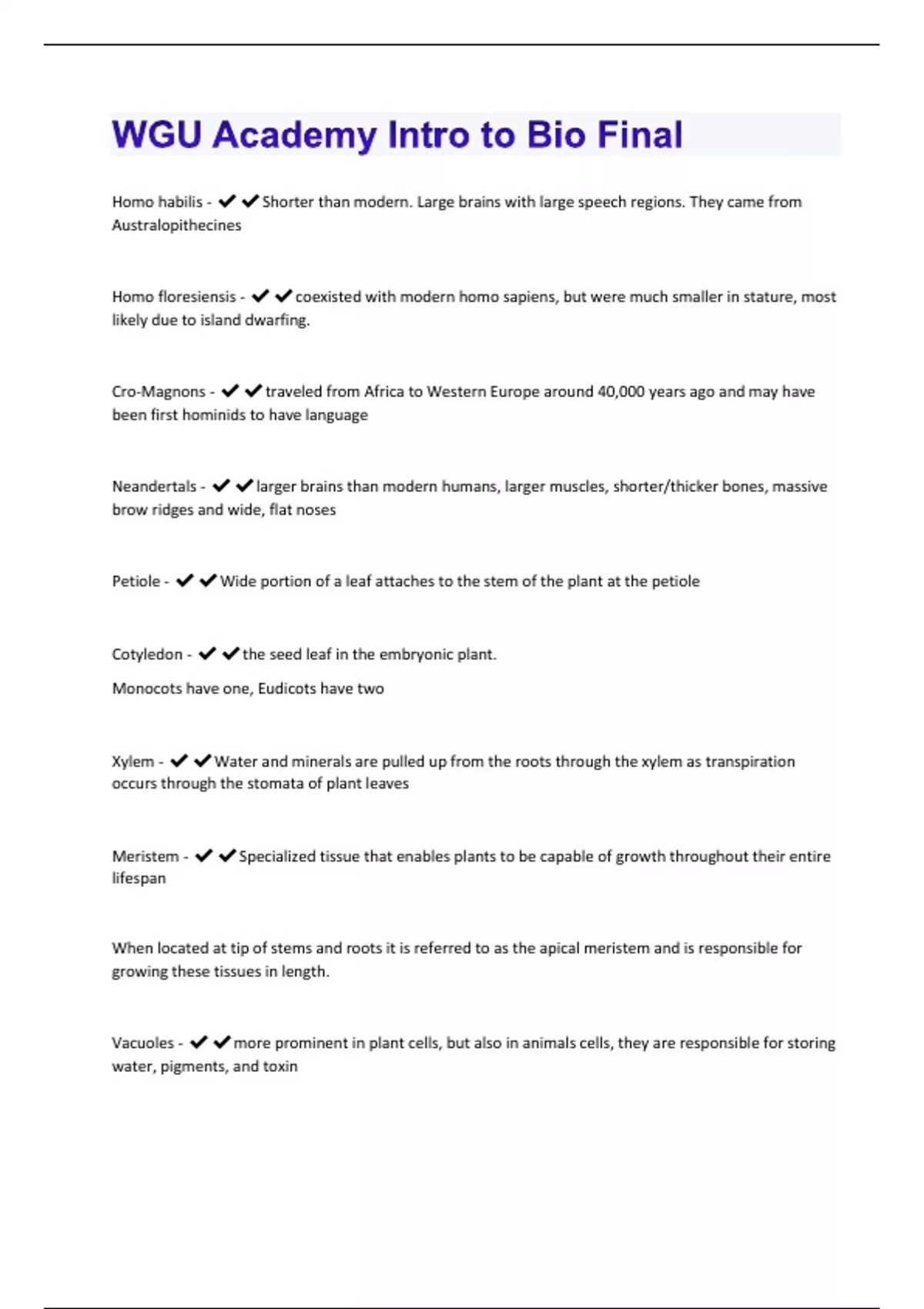 Homo habilis - Shorter than modern. Large brains with large speech regions. They came from Australopithecines Homo floresiensis - coexisted with modern homo sapiens, but were much smaller in stature, most likely due to island dwarfing. Cro-Magnons - traveled from Africa to Western Europe around 40,000 years ago and may have been first hominids to have language Neandertals - larger brains than modern humans, larger muscles, shorter/thicker bones, massive brow ridges and wide, flat noses Petiole - Wide portion of a leaf attaches to the stem of the plant at the petiole Cotyledon - the seed leaf in the embryonic plant. Monocots have one, Eudicots have two Xylem - Water and minerals are pulled up from the roots through the xylem as transpiration occurs through the stomata of plant leaves Meristem - Specialized tissue that enables plants to be capable of growth throughout their entire lifespan When located at tip of stems and roots it is referred to as the apical meristem and is responsible for growing these tissues in length. Vacuoles - more prominent in plant cells, but also in animals cells, they are responsible for storing water, pigments, and toxinGolgi Apparatus - a series of membrane stakcs that receive proteins from the endoplasmic reticulum. These proteins are modified and sorted before being discharged into secretory vesicles