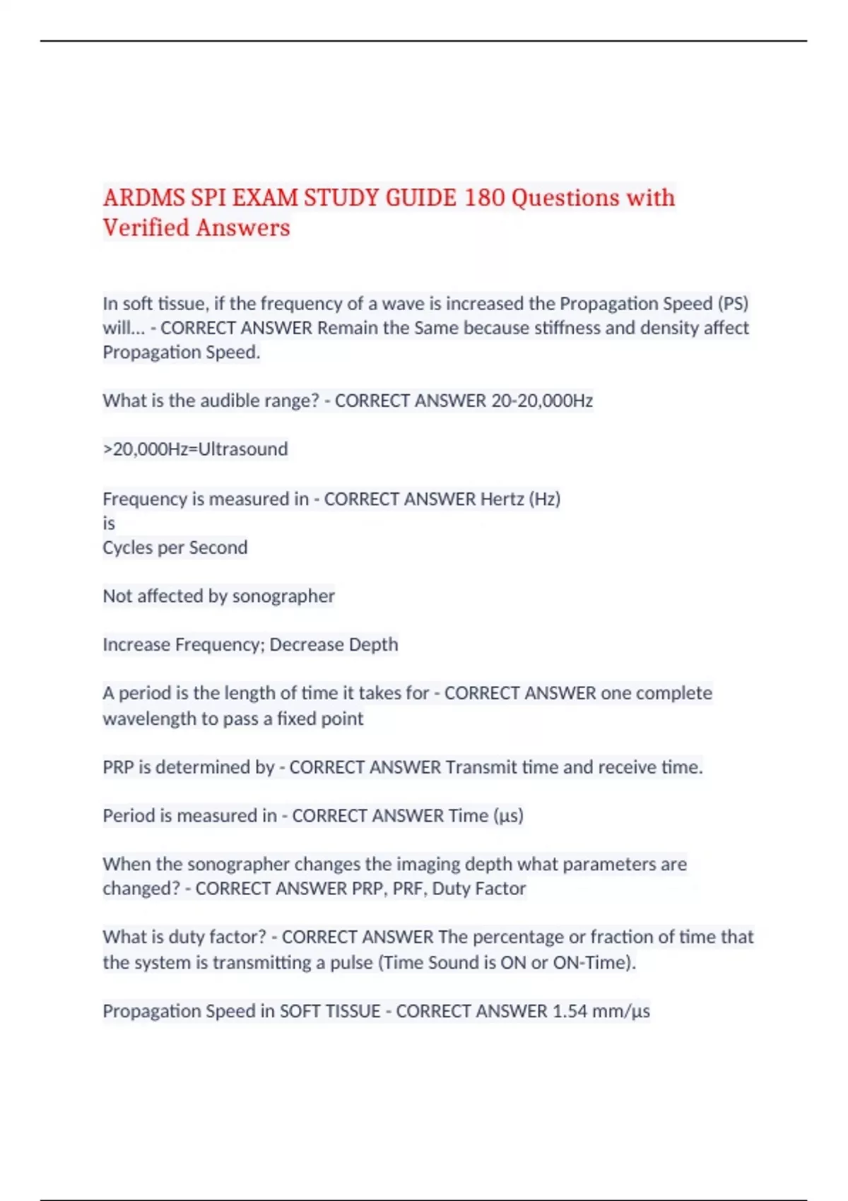 ARDMS SPI EXAM STUDY GUIDE 180 Questions with Verified Answers In soft tissue, if the frequency of a wave is increased the Propagation Speed (PS) will... - CORRECT ANSWER Remain the Same because stiffness and density affect Propagation Speed. What is the audible range? - CORRECT ANSWER 20-20,000Hz >20,000Hz=Ultrasound Frequency is measured in - CORRECT ANSWER Hertz (Hz) is Cycles per Second Not affected by sonographer Increase Frequency; Decrease Depth A period is the length of time it takes for - CORRECT ANSWER one complete wavelength to pass a fixed point PRP is determined by - CORRECT ANSWER Transmit time and receive time. Period is measured in - CORRECT ANSWER Time (μs) When the sonographer changes the imaging depth what parameters are changed? - CORRECT ANSWER PRP, PRF, Duty Factor What is duty factor? - CORRECT ANSWER The percentage or fraction of time that the system is transmitting a pulse (Time Sound is ON or ON-Time). Propagation Speed in SOFT TISSUE - CORRECT ANSWER 1.54 mm/μs (1540 m/sec) Unit of measurement for Pulse Duration, Duty Factor, PRP, and Period - CORRECT ANSWER Time, (μs) Pulse duration is determined by - CORRECT ANSWER Sound Source Only Pulse Duration is controlled by - CORRECT ANSWER the ultrasound system and transducer Pulse Duration Formula - CORRECT ANSWER pulse duration (μs) = # cycles in pulse/frequency(MHz) PD= Number of cycles in Pulse/ Frequency(Hz) Spatial Pulse Length (SPL) (measurement) - CORRECT ANSWER The distance that a pulse occupies in space from the start to the end of a pulse. (mm) Typical values for spatial pulse length in soft tissue. - CORRECT ANSWER 0.1 to 1.0 mm Spatial pulse length is determined by - CORRECT ANSWER sound source and medium Spatial Pulse Length is directly proportional to - CORRECT ANSWER the Number of Cycles in the Pulse and the Wavelength (Directly Proportional means that increased SPL will increase both the number of cycles in the pulse and the wavelength if increased). Spatial pulse length is inversely proportional to - CORRECT ANSWER Frequency (MHz) (Inversely Proportional means that increased SPL will lower frequency. This is because axial resolution is better with lower frequency) Pulse Duration (PD) - CORRECT ANSWER The actual time from the start of a pulse to the end of that pulse; a single transmit, talking, or "on" time. Time the pulse is on typically measured in (ms). Pulse Length - CORRECT ANSWER The distance of the pulse start to end or the duration or length of a single pulse Pulse Length is typically measured in (mm). the ability of an object to resist compression and relates to the hardness of a medium? - CORRECT ANSWER Stiffness. Think: ↑ Stiffness ↑ Speed ↓ Density ↑ Speed An increase in pulse repetition frequency would lead to: - CORRECT ANSWER Increasing pulse repetition frequency, increases duty factor. ↑ PRF ↑ Duty Factor Which of the following would have the highest propagation speed? - CORRECT ANSWER Bone has the highest propagation speed, at m/s. What has the lowest propagation speed? - CORRECT ANSWER air technically has the lowest propagation speed at 300 m/s Which has the Slowest Propagation Speed? Water Soft Tissue Bone Lung tissue - CORRECT ANSWER Lung Tissue As imaging depth increases, the pulse repetition frequency (PRF) must: - CORRECT ANSWER Decrease As imaging depth increase, pulse repeition freqency (PRF) decreases. ↑ Imaging Depth ↓ PRF What describes the amount of refraction that occurs at an interface? - CORRECT ANSWER Snell's law Refraction: the redirection of the transmitted sound beam Snell's law describes the angle of transmission at an interface based on the angle of incidence and the propagation speeds of the two media. Pressure is typically expressed in: - CORRECT ANSWER Pascals (Pa) The typical range of frequency for diagnostic ultrasound imaging is - CORRECT ANSWER 1-20 Mhz is the typical range of frequency for diagnostic ultrasound imaging. The attentuation coefficient in soft tissue is equal to: - CORRECT ANSWER Attentuation Coeffcient = 1/2 (one half of the frequency in soft tissue) The attentuation coeffcient (in dB/cm) is the rate at which sound is attentuated per unit depth. Micro is denoted as: - CORRECT ANSWER Micro is denoted as millionth (µ) What is described as the distance over which one cycle occurs? - CORRECT ANSWER Wavelength is distance over which one cycle occurs, or the distance from the beginning of one cycle to the end of the same cycle. Remember, it asks for distance over which one cycle occurs. Stiffness and propagation speed are - CORRECT ANSWER Directly Related Also remember: ↑ Stiffness ↑ Speed ↓ Density ↑ Speed Areas of high pressure and density are referred to as: - CORRECT ANSWER Compressions What type of wave is sound? - CORRECT ANSWER Mechanical and Longitudinal Wave The frequency ranges for ultrasound are: - CORRECT ANSWER Ultrasound frequency is 20 to 20,000 Hz The speed of sound in soft tissue is - CORRECT ANSWER Speed of sound in soft tissue is 1540 m/s Which transducer fires the elements in groups? - CORRECT ANSWER Linear sequenced array fires the elements in groups The units for wavelength is - CORRECT ANSWER Wavelength units are (Millimeters) Enhancement is caused by - CORRECT ANSWER Weakly attenuating structures The wavelength in a material having a propagation speed of 1.5 mm/µs employing a transudcer frequency of 5.0 MHz is: - CORRECT ANSWER 0.3 mm wavelength = c/f 1.5 mm/µs / 5 MHz = 0.3 mm An ultrasound transducer converts - CORRECT ANSWER Electrical energy into Mechanical energy and vice versa Lowest attenuation to highest - CORRECT ANSWER bone, muscle, fat, air If frequency doubles, what happens to the wavelength? - CORRECT ANSWER Wavelength is decreased by 1/2 Frequency and Wavelength are: - CORRECT ANSWER Inversely related What happens to intensity if the amplitude of a signal is halved? - CORRECT ANSWER Amplitude halved will result in intensity quartered amplitude = intensity2 Ultrasound pulses conta