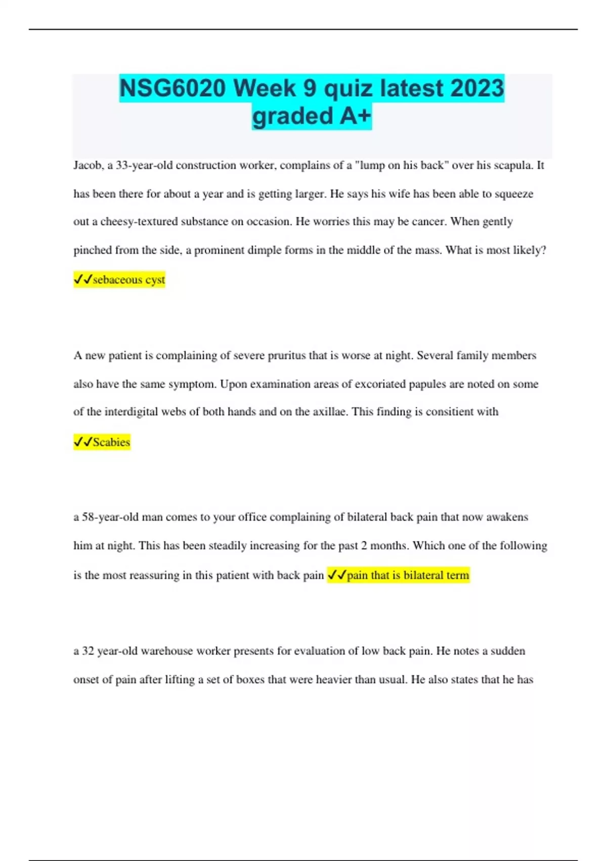 NSG6020 Week 9 quiz latest 2023 graded A+ Jacob, a 33-year-old construction worker, complains of a "lump on his back" over his scapula. It has been there for about a year and is getting larger. He says his wife has been able to squeeze out a cheesy-textured substance on occasion. He worries this may be cancer. When gently pinched from the side, a prominent dimple forms in the middle of the mass. What is most likely? sebaceous cyst A new patient is complaining of severe pruritus that is worse at night. Several family members also have the same symptom. Upon examination areas of excoriated papules are noted on some of the interdigital webs of both hands and on the axillae. This finding is consitient with Scabies a 58-year-old man comes to your office complaining of bilateral back pain that now awakens him at night. This has been steadily increasing for the past 2 months. Which one of the following is the most reassuring in this patient with back pain pain that is bilateral term a 32 year-old warehouse worker presents for evaluation of low back pain. He notes a sudden onset of pain after lifting a set of boxes that were heavier than usual. He also states that he has numbness and tingling in the left leg. He wants to know if he needs to be off of work. What test should you perform to assess for herniated disc straight- leg raise Mrs. Anderson presents with an itchy rash which is raised and appears and disappears in various locations. Each lesion lasts for many minutes. What most likely accounts for this rash? urticaria or hives a 50-year old woman presents with "left hip pain" of several weeks duration. There is marked tenderness when you press over her proximal lateral thigh. What do you think she has trochanteric bursitis a 28-year old graduate student comes to your clinic for evaluation of pain 'all over." With further questioning, she is able to relate that the pain is worse in the neck, shoulders, hands and low back and knees. She denies swelling in her joints. She states that the pain is worse in the morning. there is no limitation in her range of motion. On physical examination, she has several points on the muscles of the neck, shoulders, and back that are tender to palpation. Muscle strength and range of motion are normal. Which one of the following is likely the cause of her pain fibromyalgia a mother brings her 11 month-old to you because her mother-in-law and others have told her that her baby is jaundiced. She is eating and growing well and performing the developmental milestones she should for her age. On examination you indeed notice a yellow tone to her skin from head to toe. Her sclerae are white. To which are should you next questions be related diet you are beginning the examination of the skin on a 25-year old teacher. You have previously elicited that she came to the office for evaluation of fatigue, weight gain, and hair loss. You strongly suspect that she has hypothyroidism. What is the expected moisture and texture of the kin of a patient with hypothyroidism. dry and rough you are assessing a patient with joint pain and are trying to decide whether it is inflammatory or non inflammatory in nature. Which one of the following symptoms is consistent with an inflammatory process tenderness you are assessing a patient with diffuse joint pains and want to make sure that only the joints are the problem, and that the pain is not related to other diseases. Which of the following is a systemic cause of joint pain lupus 19-year-old college sophomorre comes to the clinic for evaluation of joint pains. The student has been back from spring break for 2 weeks; during her holiday, she went camping. She notes that she had a red spot, shaped like a target, but then it started spreading, and then the joint pains started. she used insect repellant but was in area known to have ticks. She has never been sick and takes no medications routinely; she has never been sexually active. What is the most likely cause of her joint pain lyme disease an 85-year-old retired housewife comes with her daughter to establish care. Her daughter is concerned because her mother has started to fall more. As part of her physical examination, you ask her to walk across the examination room. Which of the following is not part of the stance phase of gait? foot arched a 33-year-old construction worker comes for evaluation and treatment of acute onset of low back pain. He notes that the pain is an aching located in the lumosacral area. It has been present interittently for several years; there is no known trauma or injury. He points to the left lower back. The pain does not radiate and there is numbness or tingling in the legs or incontinence. He was moving furniture for a friend over the weekend. On physical examination, you note muscle spasm, with normal deep tendon reflexes and muscle strength. What is the most likely cause of this patient's low back pain mechanical low back pain a 50-year-old realtor comes to your office for evaluation of neck pain. She was in a motor vehicle collision 2 days ago and assessed by the emergency medical technicians on site, but she didn't think that she needed to go to the emergency room at that time. Now, she has severe pain and stiffness in her neck. On physical examination, you note pain and spasm over the paraspinous muscles on the left side of the neck, and pain when you make the patient do active range of motion of the cervical spine. What is the most likely cause of this neck pain cervical sprain a 68-year-old retired banker comes to your clinic for evaluation of left shoulder pain. He swims for 30 minutes daily, early in the morning. He notes a sharp, catching pain and a sensation of something grating when he tries overhead movements of his arm. On physical examination, you note tenderness just below the tip of the acrominon in the area of the tendon insertions. The drop arm test is negative, and there is no limitation with shoulder shrug. The patient is not holding his arm