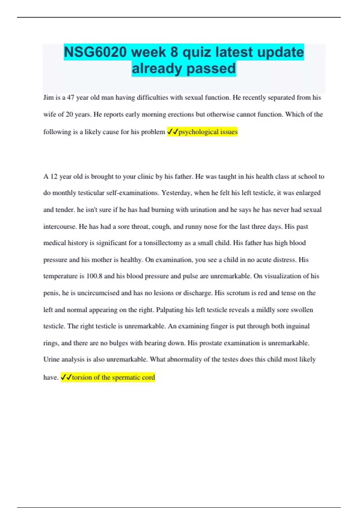 NSG6020 week 8 quiz latest update already passed Jim is a 47 year old man having difficulties with sexual function. He recently separated from his wife of 20 years. He reports early morning erections but otherwise cannot function. Which of the following is a likely cause for his problem psychological issues A 12 year old is brought to your clinic by his father. He was taught in his health class at school to do monthly testicular self-examinations. Yesterday, when he felt his left testicle, it was enlarged and tender. he isn't sure if he has had burning with urination and he says he has never had sexual intercourse. He has had a sore throat, cough, and runny nose for the last three days. His past medical history is significant for a tonsillectomy as a small child. His father has high blood pressure and his mother is healthy. On examination, you see a child in no acute distress. His temperature is 100.8 and his blood pressure and pulse are unremarkable. On visualization of his penis, he is uncircumcised and has no lesions or discharge. His scrotum is red and tense on the left and normal appearing on the right. Palpating his left testicle reveals a mildly sore swollen testicle. The right testicle is unremarkable. An examining finger is put through both inguinal rings, and there are no bulges with bearing down. His prostate examination is unremarkable. Urine analysis is also unremarkable. What abnormality of the testes does this child most likely have. torsion of the spermatic cord important techniques in performing the rectal examination include which of the following All of the above Which of the following conditions involves a tight prepuce which, once retracted, cannot be returned paraphimosis 22-year-old unemployed roofer presents to your clinic, complaining of pain in his testicle and penis. He states the pain began last night and has steadily become worse. He states it hurts when he urinates and he has not attempted intercourse since the pain began. He has tried Tylenol and Ibuprofen without improvement. He denies any fever or night sweats. His past medical history is unremarkable. He has had four previous sexual partners and has had a new partner for the last month. She is on oral contraceptives, so he has not used condoms. His parents are both in good health. On examination, you see a young man lying on his side. He appears mildly ill. His temperature is 100.2 and his blood pressure, respirations, and pulse are normal. On visualization of the penis he is circumcised, with no lesions or discharge from the meatus. Visualization of the scrotal skin appears unremarkable. Palpation of the testes shows severe tenderness at the superior pole of the normal-sized left testicle. He also has tenderness when you palpate the structures superior to the testicle through the scrotal wall. The right testicle is unremarkable. An examining finger is placed through each inguinal ring without bulges being noted with bearing down. His prostate examination is unremarkable. Urine analysis shows white blood cells and bacteria. What diagnosis of the male genitalia is most likely in this case? Acute epididymitis Francis is a middle-aged man who noted right sided lower abdominal pain after straining with yardwork. Which of the following findings would make a hernia a more likely diagnosis? absence of symmetry of the inguinal areas with straining which is the most common cause of cancer deaths in males lung cancer which of the following would lead you to suspect a hydrocele versus other causes of scrotal swelling a positive transillumination test Induration along the ventral surface of the penis suggest which of the following? urethral stricture A 28-year old male presents with a painless, solitary chancre on the shaft of his penis and nontender inguinal lymphadenopathy. What is the most likely diagnosis? herpes simplex Frank is a 24-year-old man who presents with multiple burning erosions on the shaft of his penis and some tender inguinal adenopathy. Which of the following is most likely? herpes simplex A 29-year-old married computer programmer comes to the clinic complaining of "something strange" going on in his scrotum. Last month while he was doing his self-testicular examination he felt a lump in his left testis. He waited a month and felt the area again but the lump was still there. He has had some aching in his left testis but denies any pain with urination or sexual intercourse. He denies any fever, malaise, or night sweats. His past medical history consists of groin surgery when he was a baby and a tonsillectomy as a teenager. He eats a healthy diet and works out at the gym five times a week. He denies any tobacco or illegal drugs and drinks alcohol occasionally. His parents are both healthy. Examination shows a muscular healthy young man with unremarkable vital signs. On visualization the penis is circumcised with no lesions; there is a scar in his right inguinal region. There is no lymphadenopathy. Palpation of his scrotum is unremarkable on the right but has a large mass on the left. While placing a finger through the inguinal ring on the right, the examiner asks the client to bear down. Nothing is felt. The examiner attempts to place a finger through the left inguinal ring but cannot get above the mass. On rectal examination the client's prostate is unremarkable. What disorder of the testes is most likely? scrotal hernia A 60-year-old security officer comes to your clinic, complaining of a painless mass in his scrotum. He found it three days ago during a testicular self-examination. He has had no burning with urination and no pain during sexual intercourse. He denies any weight loss, weight gain, fever, or night sweats. His past medical history is notable for high blood pressure. He is married and has three healthy children. He denies using illegal drugs, smokes two to three cigars a week, and drinks six to eight alcoholic beverages per week. His mother is in good health and his father had high bl