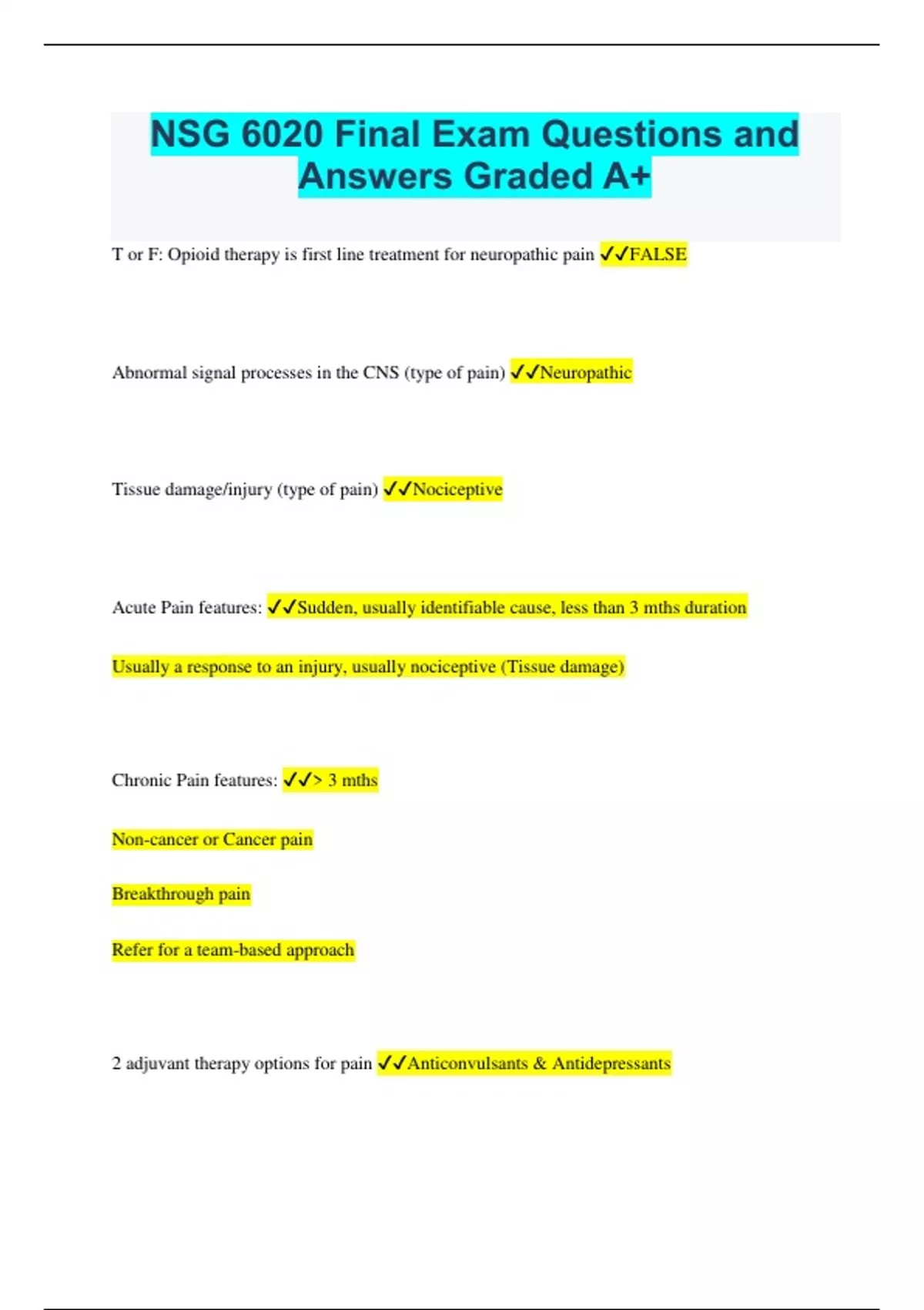 NSG 6020 Final Exam Questions and Answers Graded A+ T or F: Opioid therapy is first line treatment for neuropathic pain FALSE Abnormal signal processes in the CNS (type of pain) Neuropathic Tissue damage/injury (type of pain) Nociceptive Acute Pain features: Sudden, usually identifiable cause, less than 3 mths duration Usually a response to an injury, usually nociceptive (Tissue damage) Chronic Pain features: > 3 mths Non-cancer or Cancer pain Breakthrough pain Refer for a team-based approach 2 adjuvant therapy options for pain Anticonvulsants & Antidepressants 1st line for mild-moderate pain control Acetaminophen, NSAIDs Use __________ doses of acetaminophen or NSAIDs before proceeding to opioid analgesics MAX doses Considerations for NSAID therapy Cardiovascular and GI bleeding Which is anti-inflammatory? Tylenol or NSAIDs? NSAIDs Which alters platelet functioning? Tylenol or NSAIDs? NSAIDs. Tylenol does NOT alter platelet functioning Adverse effect of Acetaminophen Hepatotoxicity; most common cause of acute liver failure in US T or F: Acetaminophen interacts w/ warfarin/Coumadin. If so, how? TRUE; prolongs INR Max dosing of Acetaminophen for adults? For elderly? 3,000 mg/day on back of OTC labels- can be up to 4,000 mg/day under medical supervision (short term) 2,000 mg/day for elderly (less GI risk) Warn about other sources in OTC products Drug of choice for analgesic and antipyretic issues in pregnancy and while lactating Acetaminophen T or F: short to moderate acting NSAIDs are preferred for most patients? True (Ex. Naproxen- Alleve or Ibuprofen - Advil) _________ interfere w/ the cardioprotective effect of aspirin NSAIDs ___________ may have less CV toxicity than comparable doses of other NSAIDs Naproxen