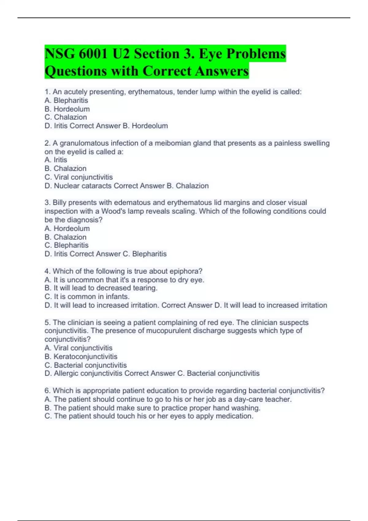 1. An acutely presenting, erythematous, tender lump within the eyelid is called: A. Blepharitis B. Hordeolum C. Chalazion D. Iritis Correct Answer B. Hordeolum 2. A granulomatous infection of a meibomian gland that presents as a painless swelling on the eyelid is called a: A. Iritis B. Chalazion C. Viral conjunctivitis D. Nuclear cataracts Correct Answer B. Chalazion 3. Billy presents with edematous and erythematous lid margins and closer visual inspection with a Wood's lamp reveals scaling. Which of the following conditions could be the diagnosis? A. Hordeolum B. Chalazion C. Blepharitis D. Iritis Correct Answer C. Blepharitis 4. Which of the following is true about epiphora? A. It is uncommon that it's a response to dry eye. B. It will lead to decreased tearing. C. It is common in infants. D. It will lead to increased irritation. Correct Answer D. It will lead to increased irritation 5. The clinician is seeing a patient complaining of red eye. The clinician suspects conjunctivitis. The presence of mucopurulent discharge suggests which type of conjunctivitis? A. Viral conjunctivitis B. Keratoconjunctivitis C. Bacterial conjunctivitis D. Allergic conjunctivitis Correct Answer C. Bacterial conjunctivitis 6. Which is appropriate patient education to provide regarding bacterial conjunctivitis? A. The patient should continue to go to his or her job as a day-care teacher. B. The patient should make sure to practice proper hand washing. C. The patient should touch his or her eyes to apply medication.
