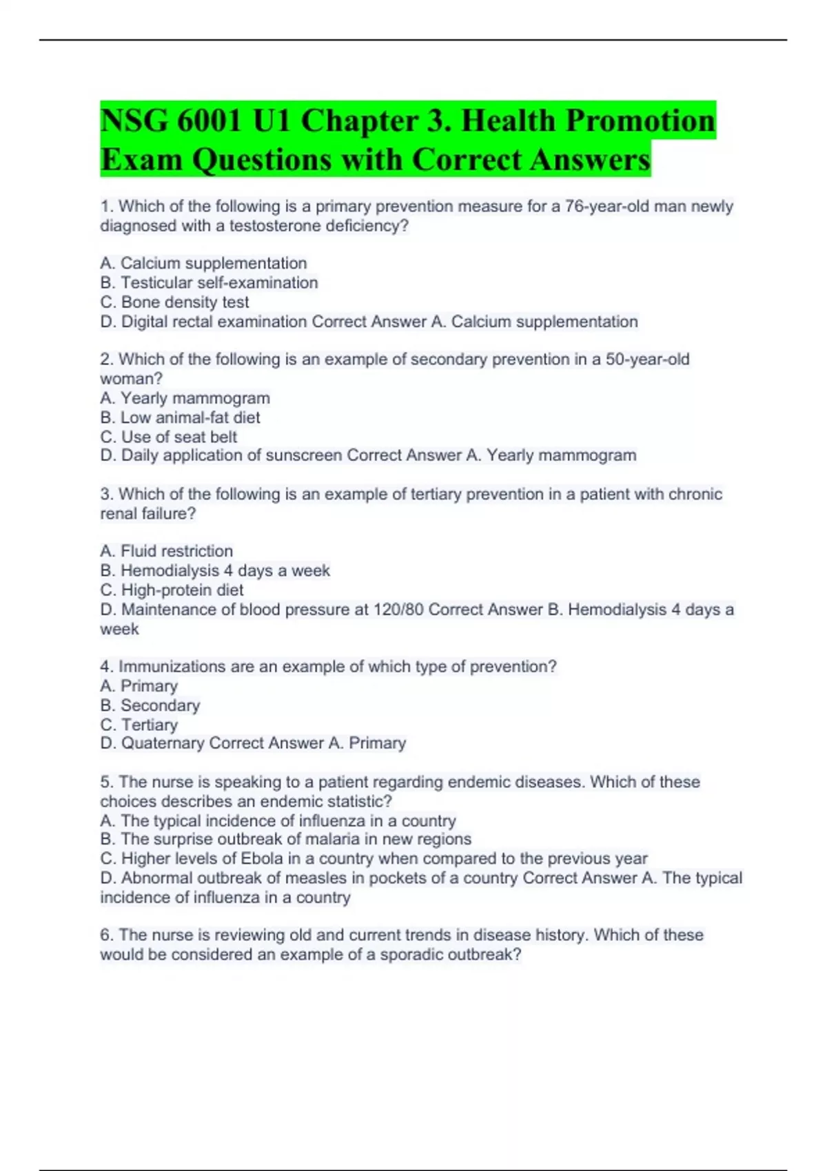 1. Which of the following is a primary prevention measure for a 76-year-old man newly diagnosed with a testosterone deficiency? A. Calcium supplementation B. Testicular self-examination C. Bone density test D. Digital rectal examination Correct Answer A. Calcium supplementation 2. Which of the following is an example of secondary prevention in a 50-year-old woman? A. Yearly mammogram B. Low animal-fat diet C. Use of seat belt D. Daily application of sunscreen Correct Answer A. Yearly mammogram 3. Which of the following is an example of tertiary prevention in a patient with chronic renal failure? A. Fluid restriction B. Hemodialysis 4 days a week C. High-protein diet D. Maintenance of blood pressure at 120/80 Correct Answer B. Hemodialysis 4 days a week 4. Immunizations are an example of which type of prevention? A. Primary B. Secondary C. Tertiary D. Quaternary Correct Answer A. Primary 5. The nurse is speaking to a patient regarding endemic diseases. Which of these choices describes an endemic statistic? A. The typical incidence of influenza in a country B. The surprise outbreak of malaria in new re
