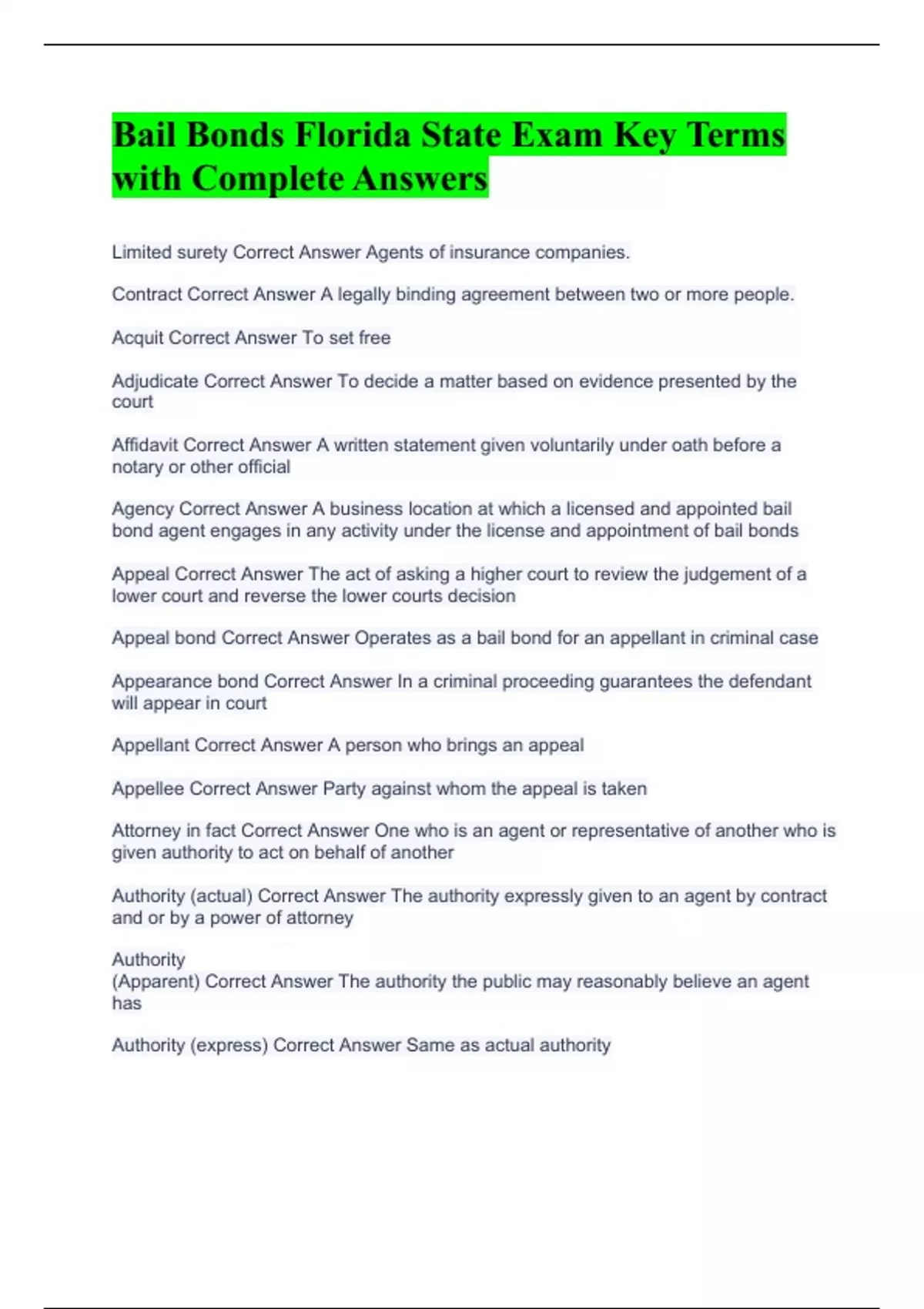 Bail Bonds Florida State Exam Key Terms with Complete Answers