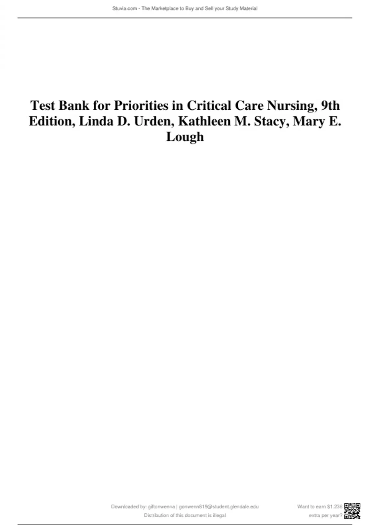 Test Bank for Critical Care Nursing: Diagnosis and Management 9th Edition By Linda D. Urden; Kathleen M. Stacy; Mary E. Lough Complete Guide A+ During World War II, what type of wards were developed to care for critically injured patients? a. Intensive care b. Triage c. Shock d. Postoperative ANS: C During World War II, shock wards were established to care for critically injured patients. Triage wards establish the order in which a patient is seen or treated upon arrival to a hospital. Postoperative wards were developed in 1900 and later evolved into intensive care units. PTS: 1 DIF: Cognitive Level: Remembering REF: p. 1 OBJ: Nursing Process Step: N/A TOP: Critical Care Nursing Practice MSC: NCLEX: Safe and Effective Care Environment 2. What type of practitioner has a broad depth of specialty knowledge and expertise and manages complex clinical and system issues? a. Registered nurses b. Advanced practice nurses c. Clinical nurse leaders d. Intensivists ANS: B Advanced practice nurses (APNs) have a broad depth of knowledge and expertise in their specialty area and manage complex clinical and systems issues. Intensivists are medical practitioners who manage the critical ill patient. Registered nurses (RNs) are generally direct care providers. Clinical nurse leaders (CNLs) generally do not manage system issues. PTS: 1 DIF: Cognitive Level: Remembering REF: p. 2 OBJ: Nursing Process Step: N/A TOP: Critical Care Nursing Practice MSC: NCLEX: Safe and Effective Care Environment 3. What type of practitioner is instrumental in ensuring care that is evidence based and that safety programs are in place? a. Clinical nurse specialist b. Advanced practice nurse c. Registered nurses d. Nurse practitioners ANS: A Downloaded by: giftonwenna | Distribution of this document is illegal Want to earn $1.236 extra per year? S - The Marketplace to Buy and Sell your Study Material S - The Marketplace to Buy and Sell your Study Material Clinical nurse specialists (CNSs) serve in specialty roles that use their clinical, teaching, research, leadership, and consultative abilities. They are instrumental in ensuring that care is evidence based and that safety programs are in place. Advanced practice nurses (APNs) have a broad depth of knowledge and expertise in their specialty area and manage complex clinical and systems issues. Registered nurses are generally direct care providers. Nurse practitioners (NPs) manage direct clinical care of groups of patients. PTS: 1 DIF: Cognitive Level: Remembering REF: p. 2 OBJ: Nursing Process Step: N/A TOP: Critical Care Nursing Practice MSC: NCLEX: Safe and Effective Care Environment 4. Which professional organization administers critical care certification exams for registered nurses? a. State Board of Registered Nurses b. National Association of Clinical Nurse Specialist c. Society of Critical Care Medicine d. American Association of Critical-Care Nurses