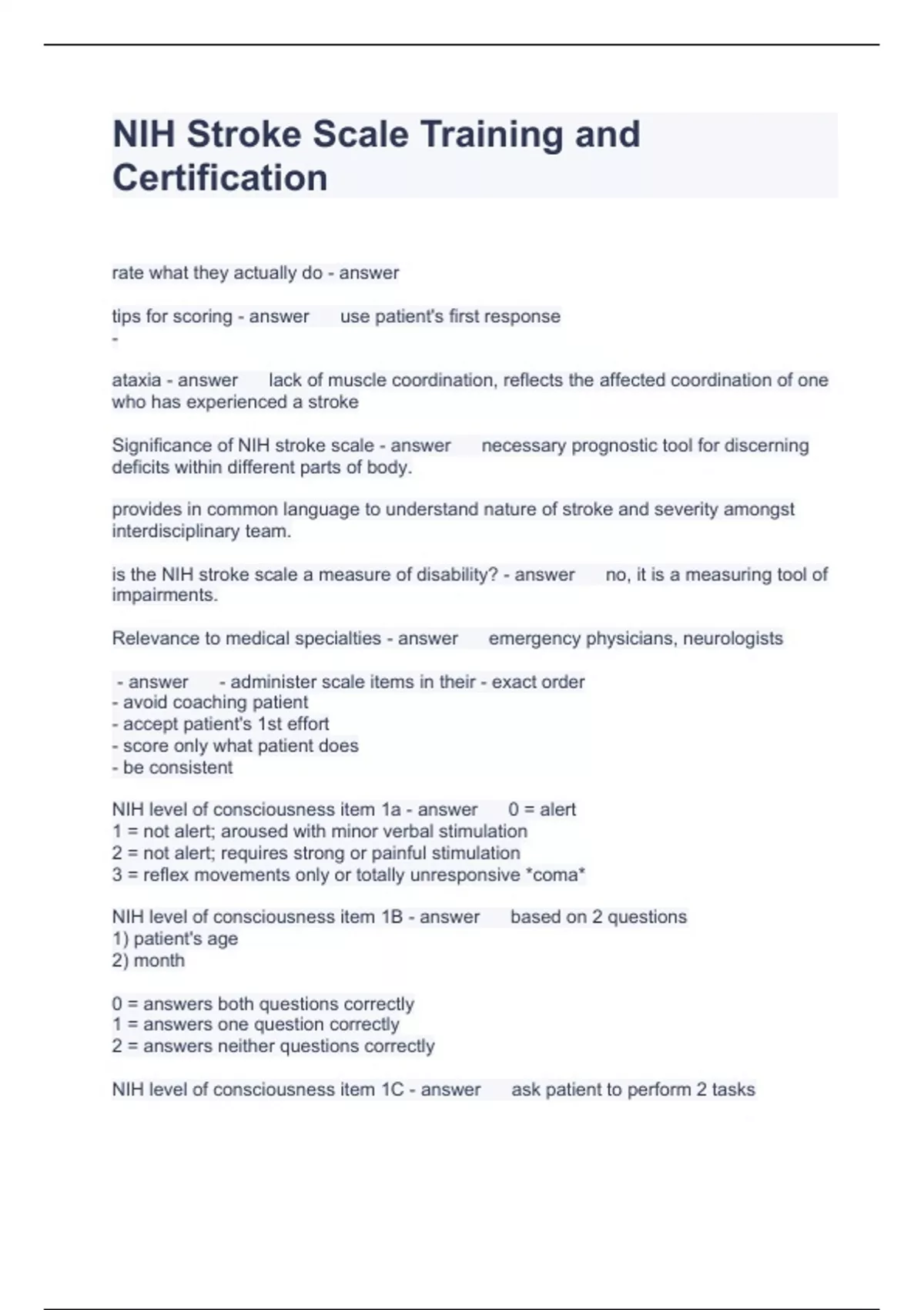NIH Stroke Scale Training and Certification Questions with correct Answers