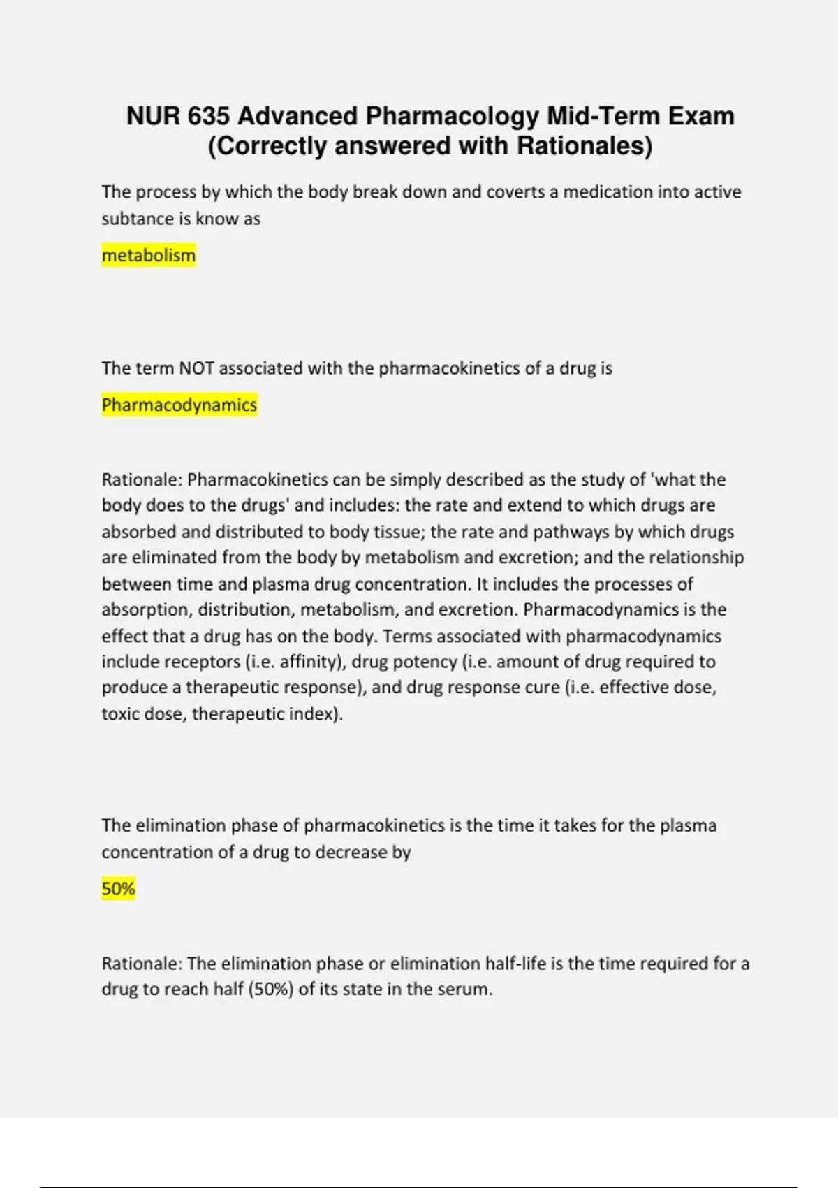 NUR 635 Advanced Pharmacology Mid-Term Exam (Correctly answered with Rationales)