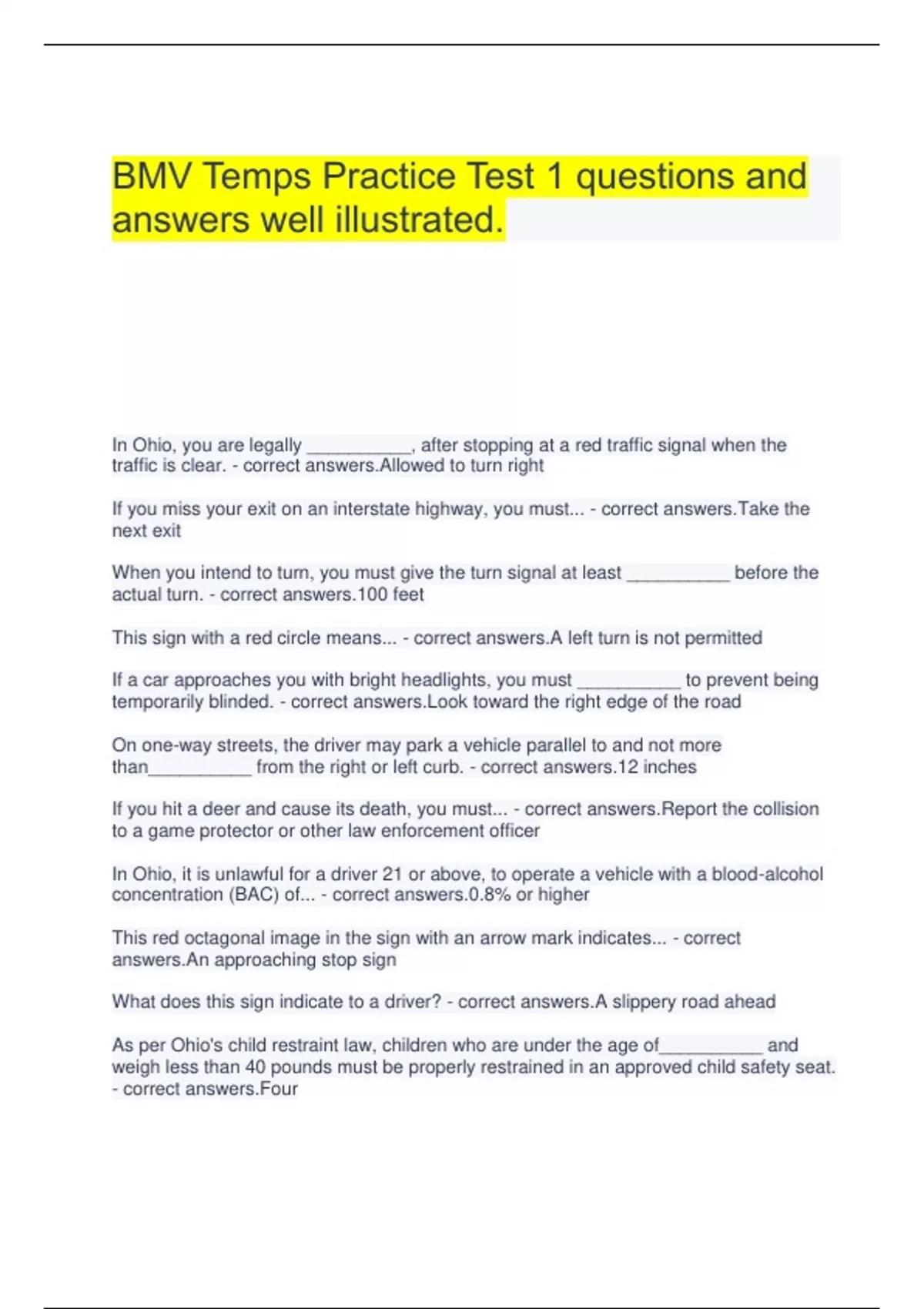 BMV Temps Practice Test 1 questions and answers well illustrated. In Ohio, you are legally __________, after stopping at a red traffic signal when the traffic is clear. - correct answers.Allowed to turn right If you miss your exit on an interstate highway, you must... - correct answers.Take the next exit When you intend to turn, you must give the turn signal at least __________ before the actual turn. - correct answers.100 feet This sign with a red circle means... - correct answers.A left turn is not permitted If a car approaches you with bright headlights, you must __________ to prevent being temporarily blinded. - correct answers.Look toward the right edge of the road On one-way streets, the driver may park a vehicle parallel to and not more than__________ from the right or left curb. - correct answers.12 inches If you hit a deer and cause its death, you must... - correct answers.Report the collision to a game protector or other law enforcement officer In Ohio, it is unlawful for a driver 21 or above, to operate a vehicle with a blood-alcohol concentration (BAC) of... - correct answers.0.8% or higher This red octagonal image in the sign with an arrow mark indicates... - correct answers.An approaching stop sign What does this sign indicate to a driver? - correct answers.A slippery road ahead As per Ohio's child restraint law, children who are under the age of__________ and weigh less than 40 pounds must be properly restrained in an approved child safety seat. - correct answers.Four It is against the law to make a left turn at a red light EXCEPT... - correct answers.From a one-way street to another one-way street You are allowed to drive in the left lane of the highway in all of the following situations, except... - correct answers.When moving slower than the posted speed sign What does this sign indicate? - correct answers.A sharp turn to the right ahead The maximum speed limit in all alleys within a municipal corporation is... - correct answers.15 mph When a driver is being passed by another vehicle, the law requires the driver of the slower vehicle... - correct answers.To maintain a constant speed and stay to the right until the other driver has safely passed When you are closely following another vehicle at night, you must use... - correct answers.Low-beam headlights If a school bus with its four red lights flashing is stopped on a street or road which has fewer than four lanes, then... - correct answers.All traffic must stop from all directions and wait till the lights have gone up This sign at an intersection directs... - correct answers.Pedestrians to enter the crosswalk When you are approaching the rear of a vehicle with an orange triangle, you must... - correct answers.Pass with care This regulatory sign is used.. - correct answers.To prohibit traffic from entering a restricted road Which of the following statements about posted speed limits is true? - correct answers.The maximum speed limit is 35 on all state routes or through highways if the speed limit is not posted When your vehicle starts to skid in winter due to icy road conditions, you must... - correct answers.Turn the steering wheel in the direction of the skid If your vehicle stalls while on the tracks and a train is approaching, you must... - correct answers.Get out of the vehicle and run as far away from the tracks as you can Which of the following results in a six-point traffic violation? - correct answers.Willingly fleeing or eluding a law enforcement officer